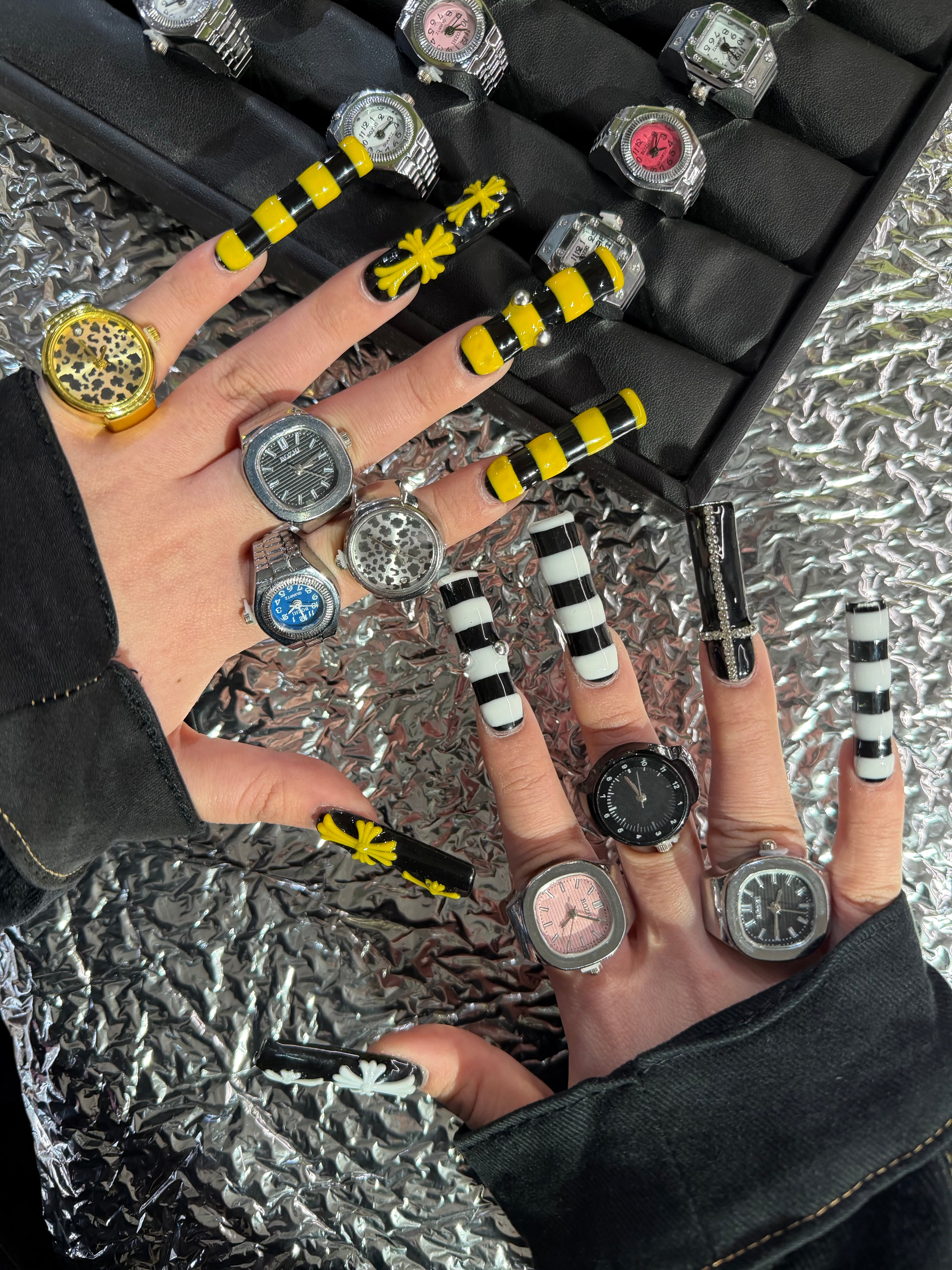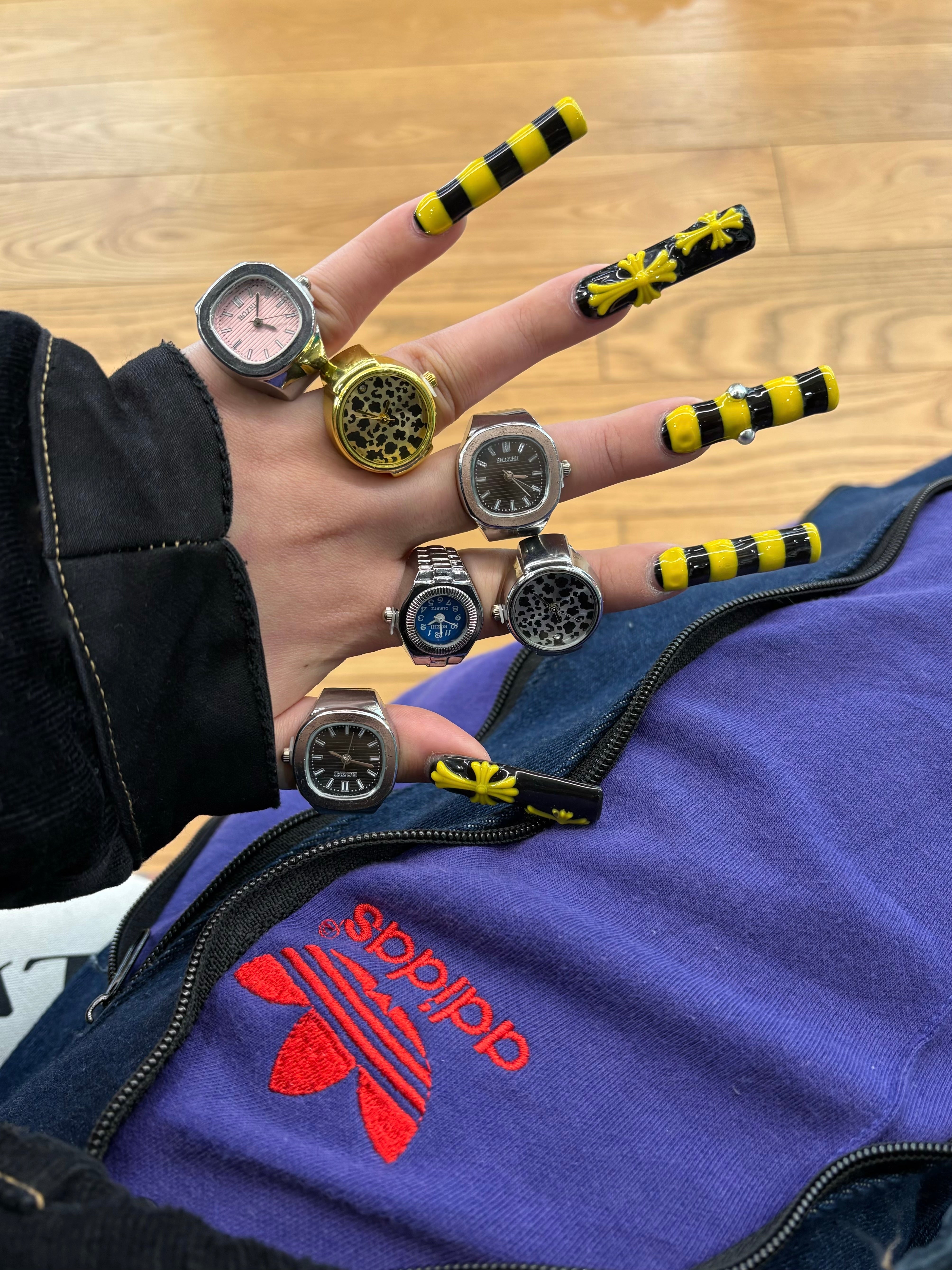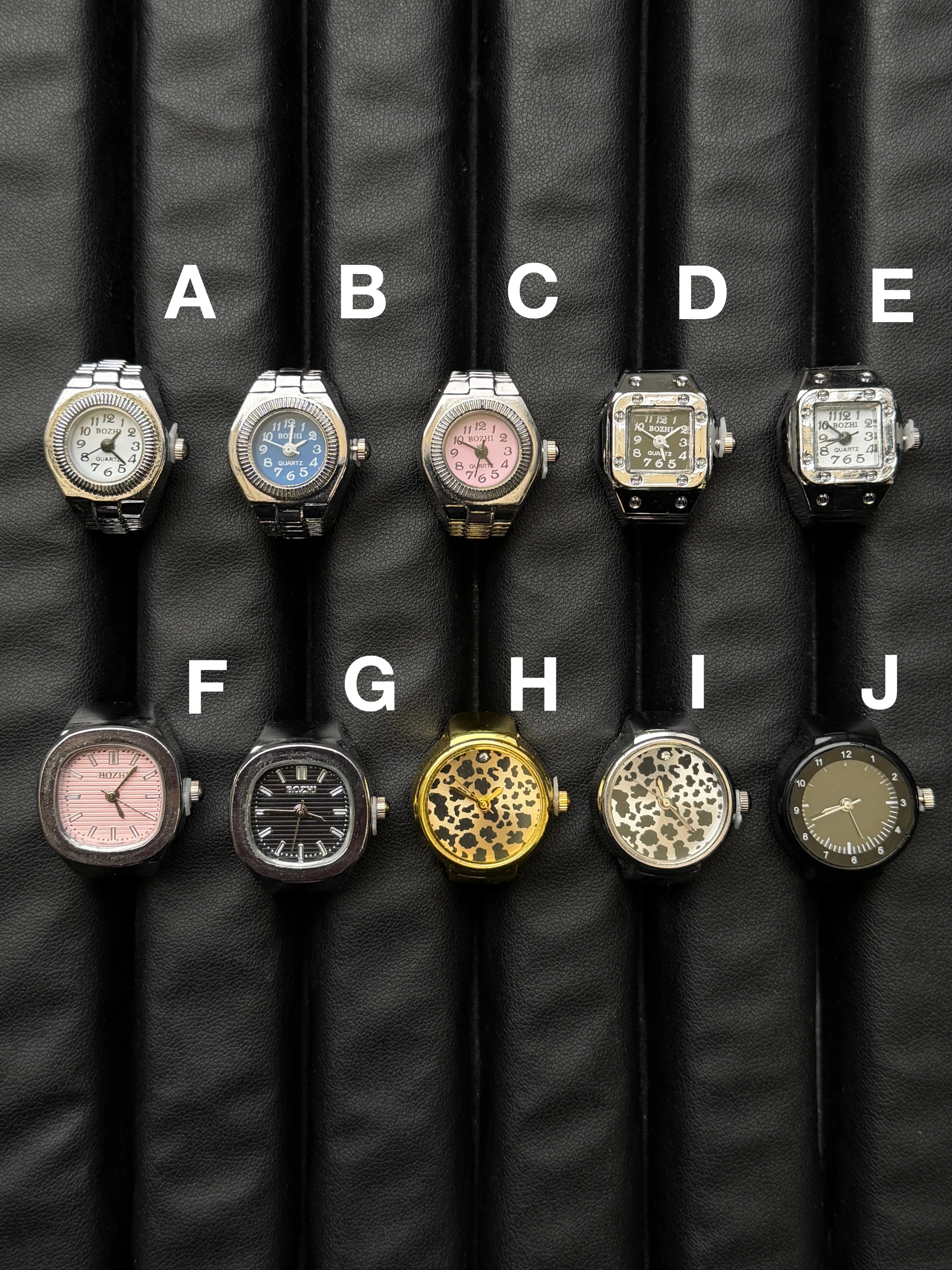 【時計リング ウォッチリング】遊び心溢れる時計型リング◎アクセサリー感覚で楽しめる、時計モチーフのリングウォッチ。クラシックな腕時計デザインをそのまま指先サイズに落とし込んだ、コーデのアクセントになるファッションアイテム。ゴム仕様で伸縮するため、サイズを気にせず着用でき、男女問わず使いやすいユニセックス仕様です。さらに、針は実際に動く仕様になっており、見た目だけでなくディテールまでこだわったデザインに仕上がっています。