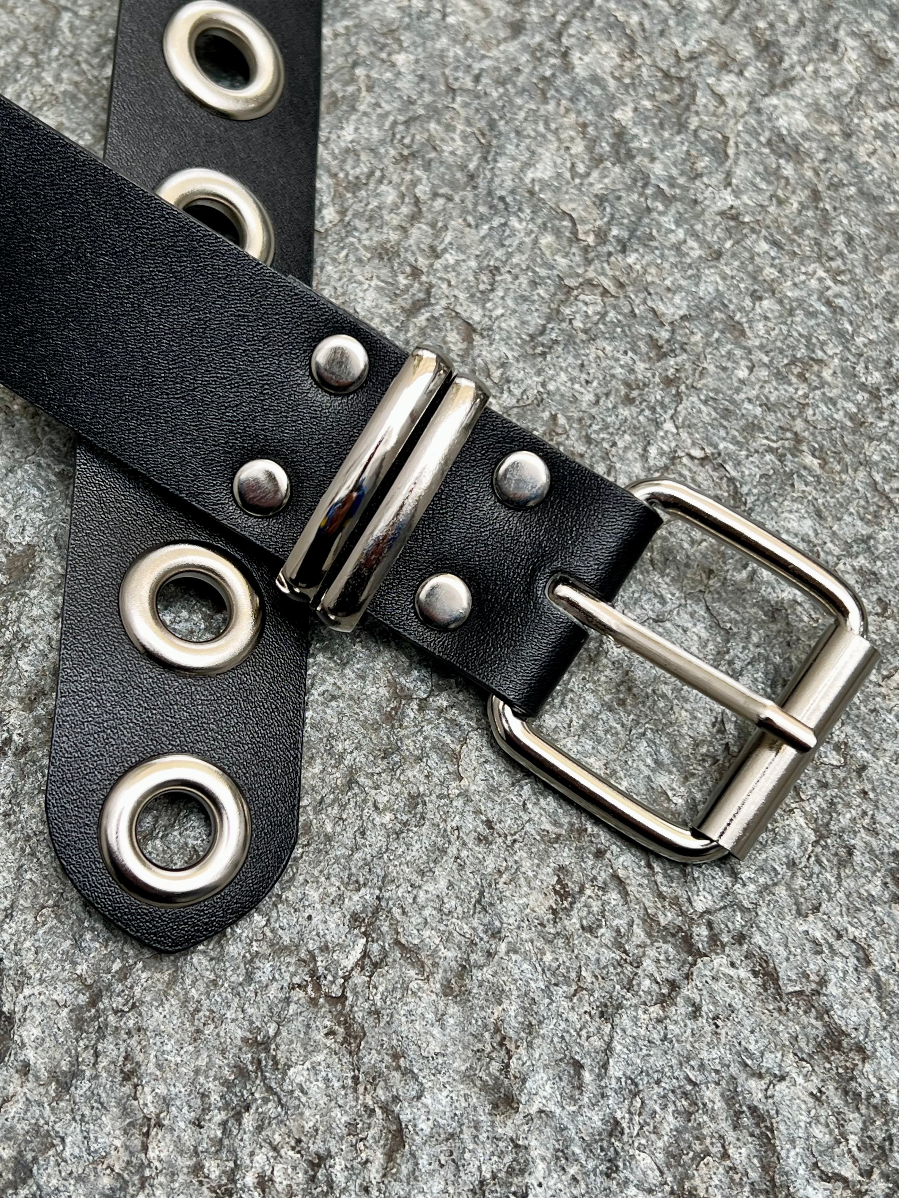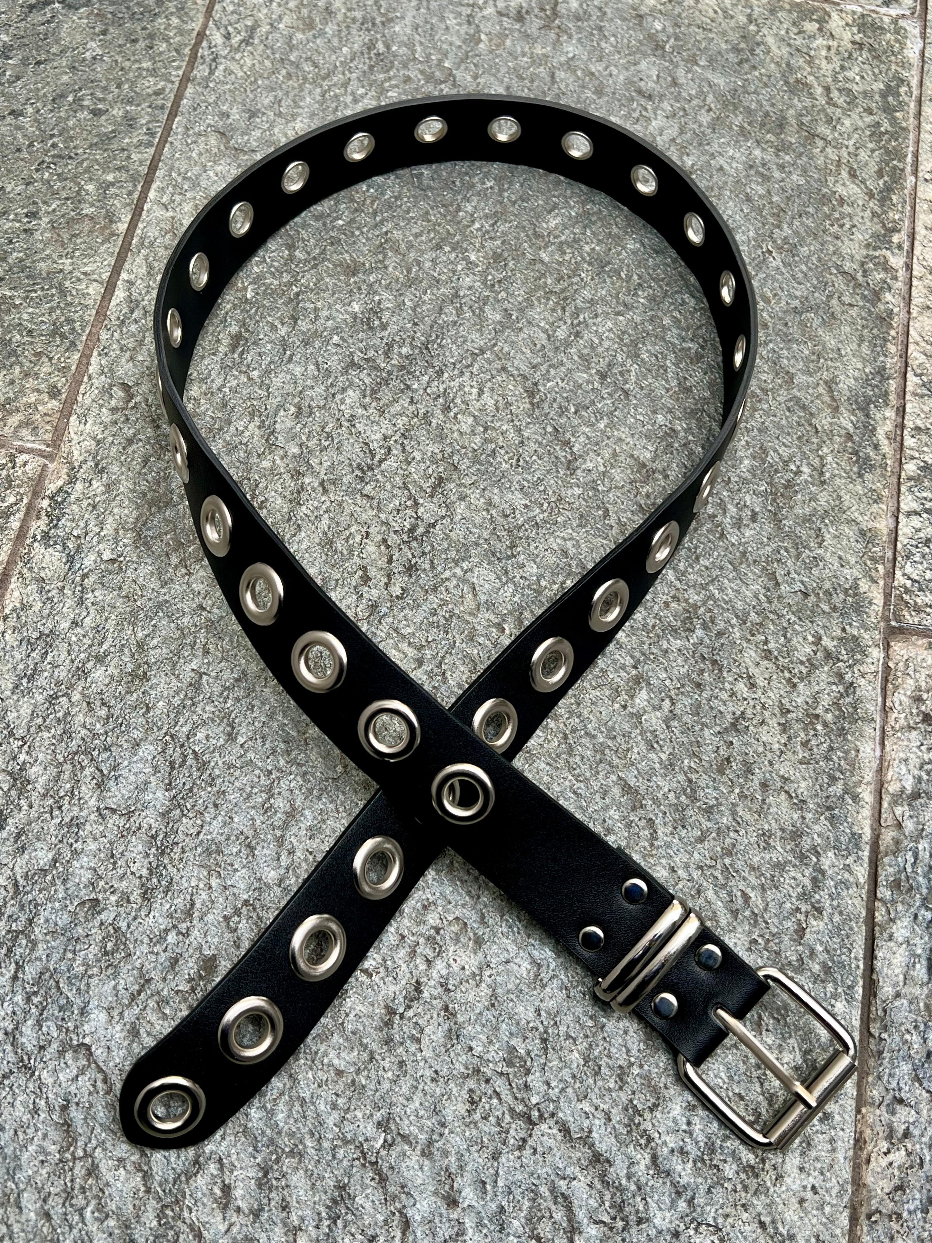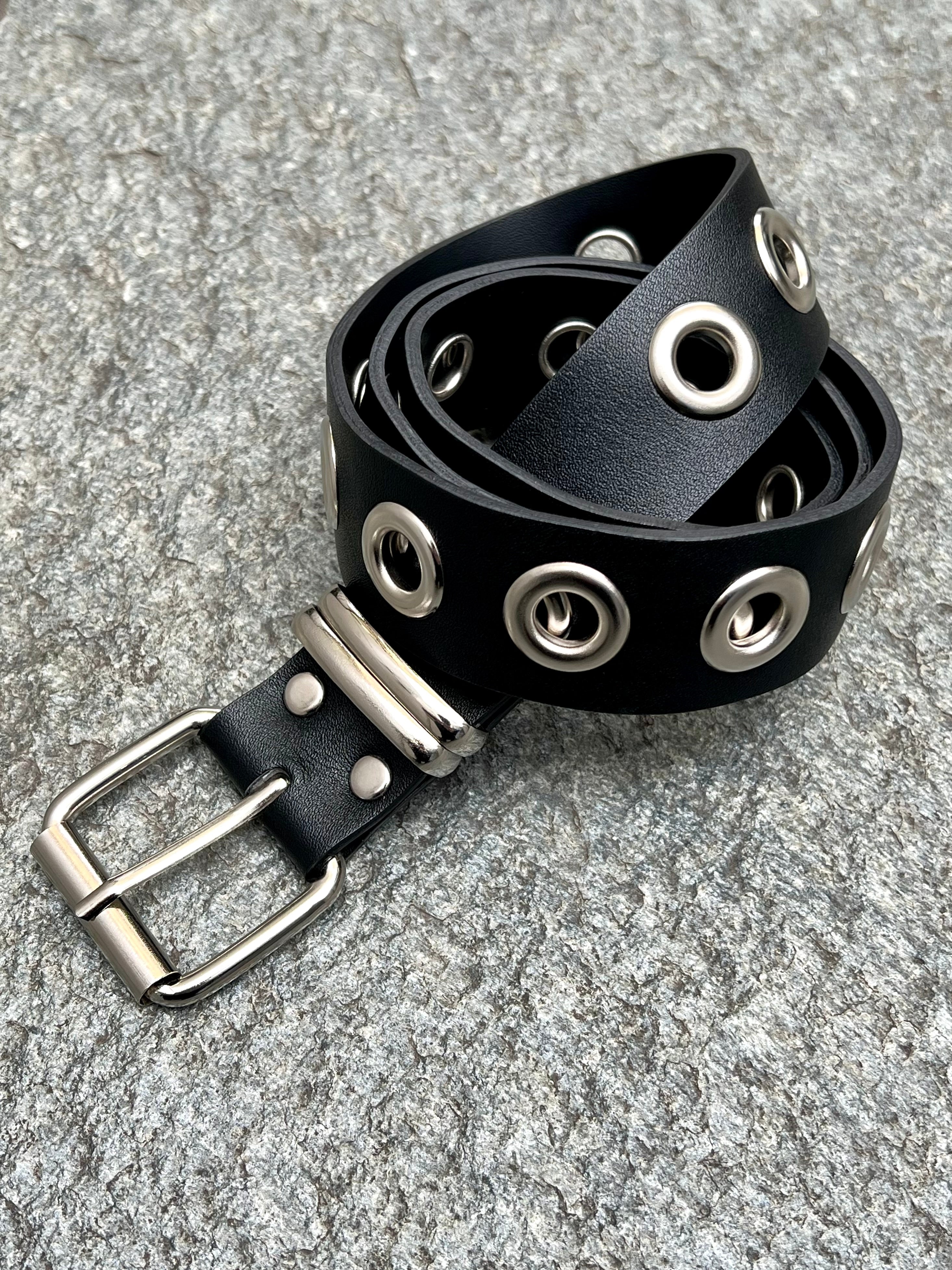 スタイリッシュでエッジの効いた印象を与えるブラックのアイレットベルト。シルバーのメタルアイレット(ハトメ)がベルト全体に並び、存在感のあるデザインに仕上がっています。ユニセックスで使える定番アイテムです。