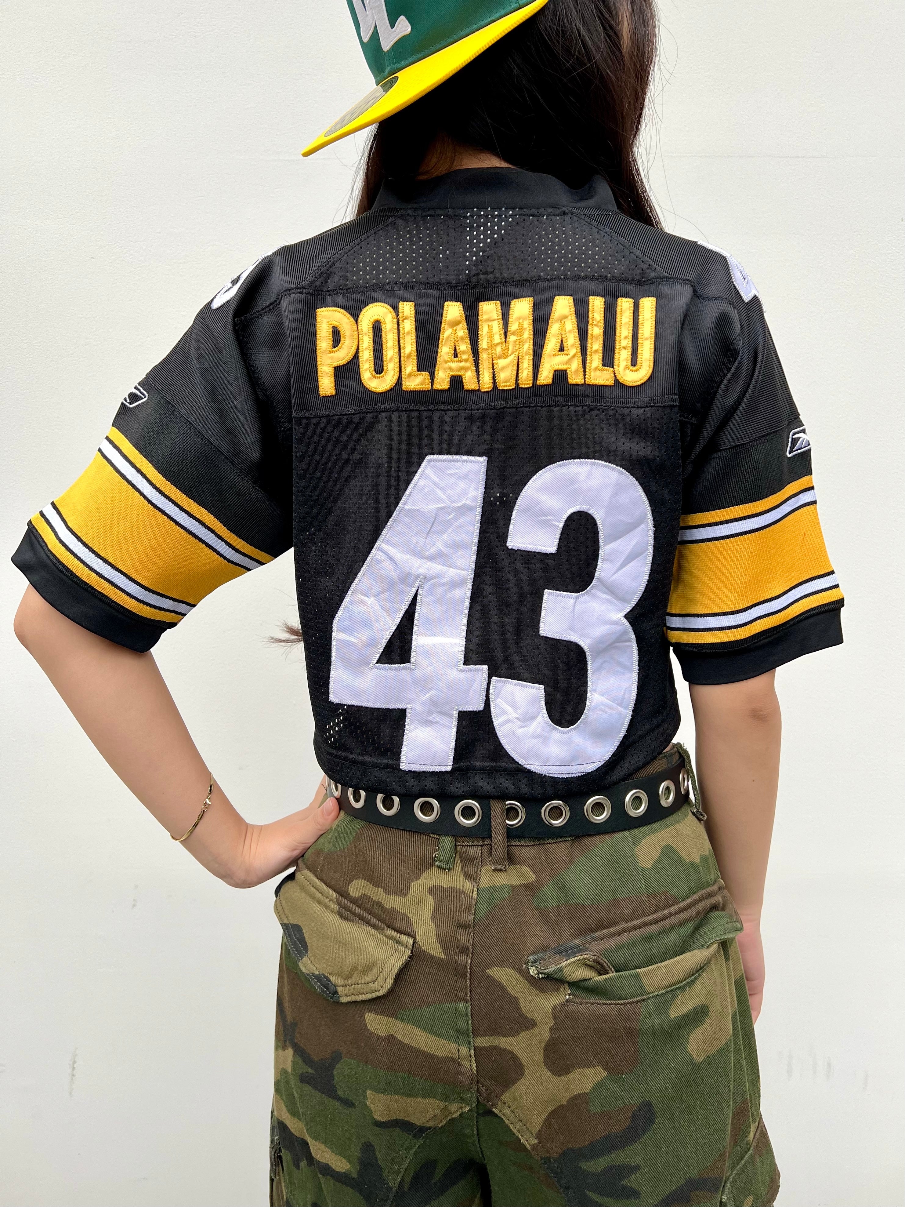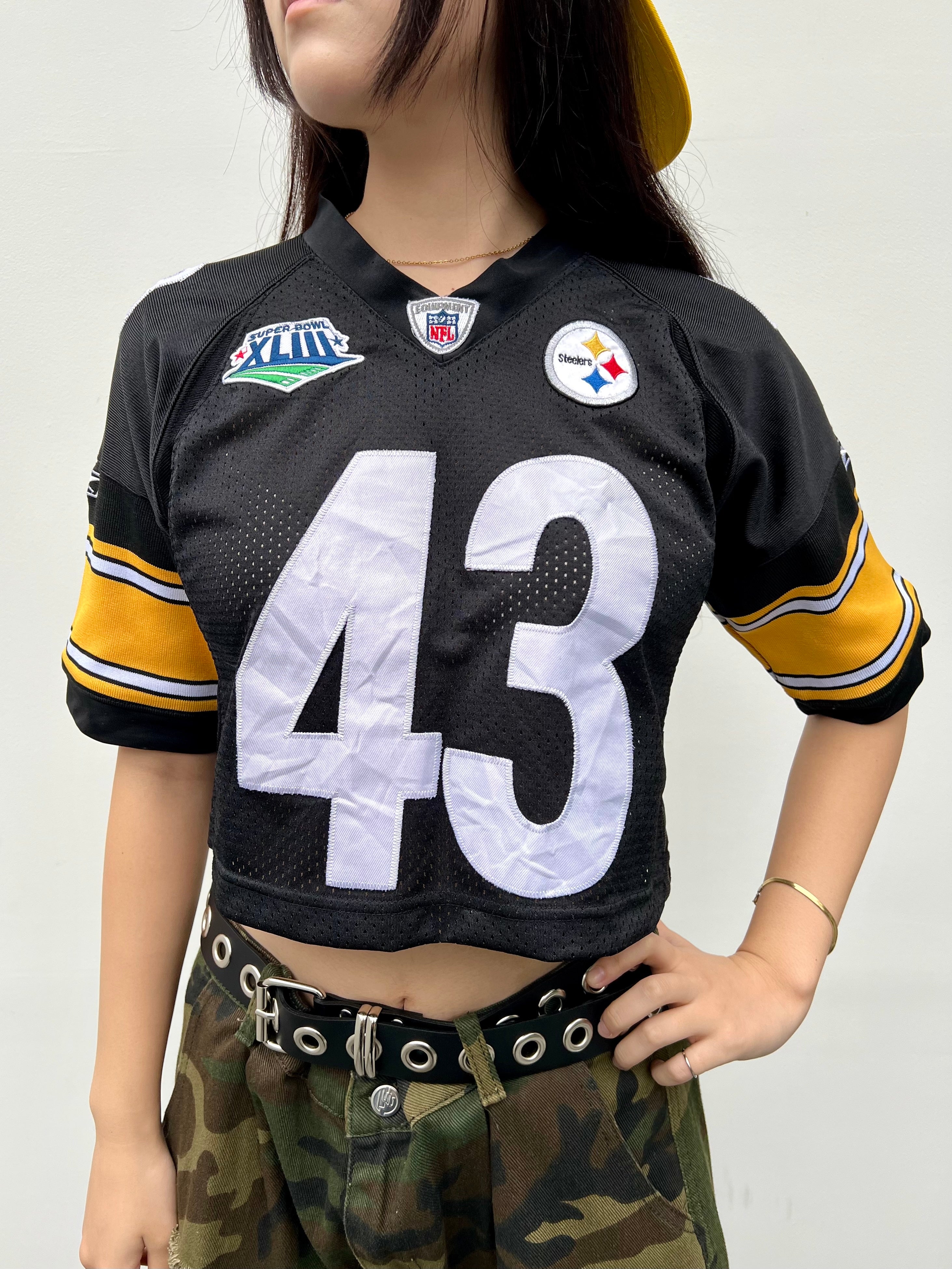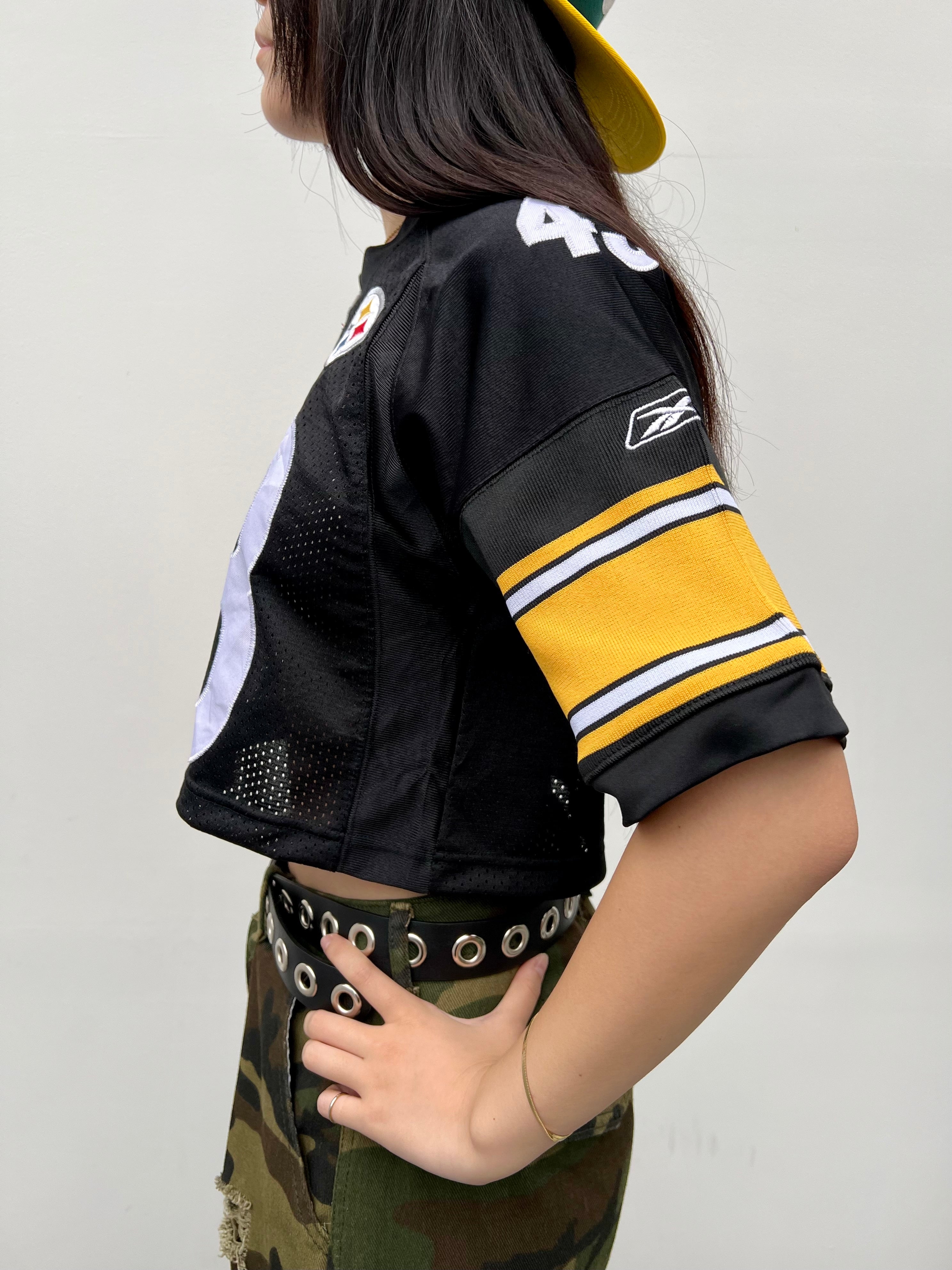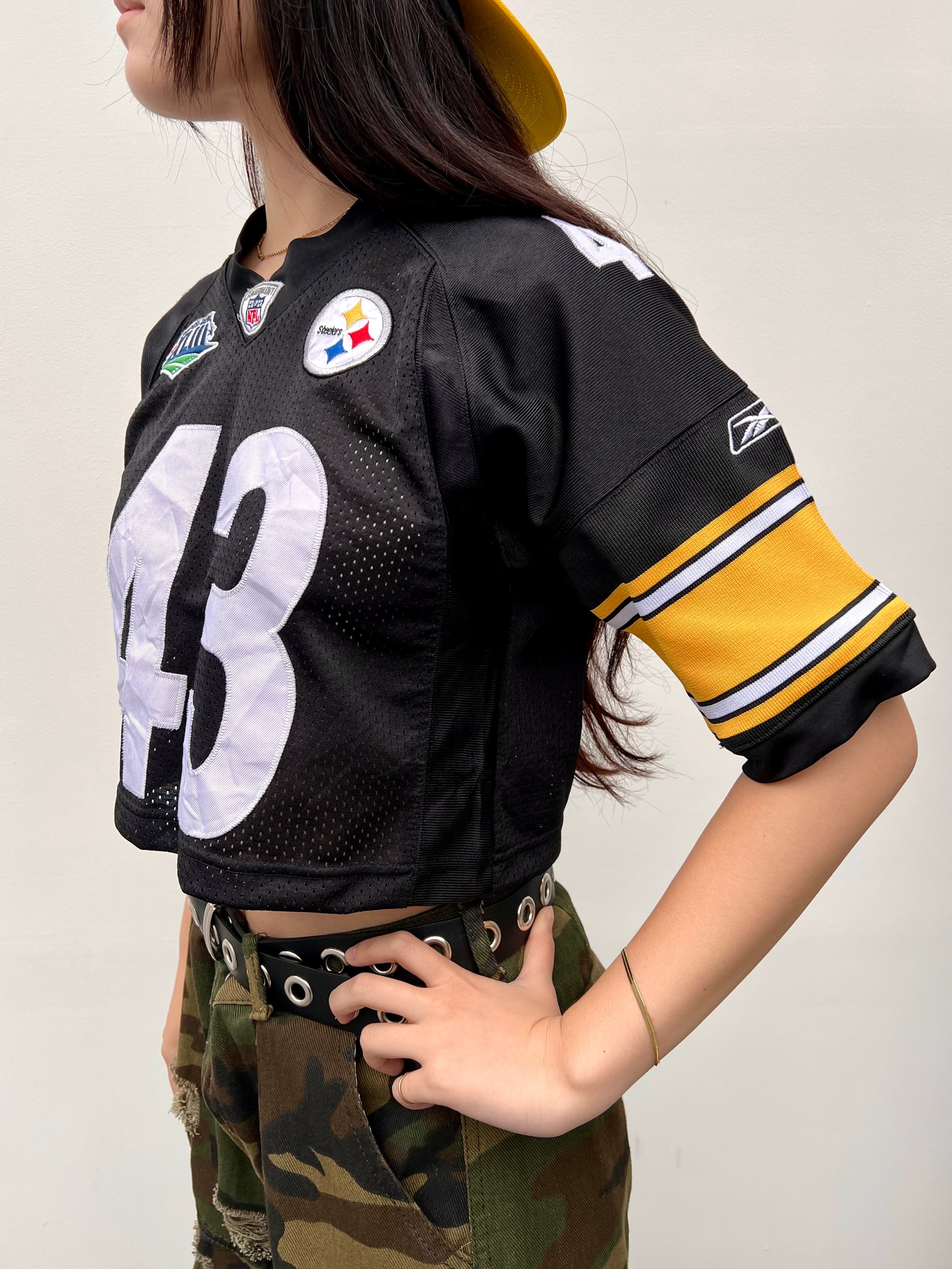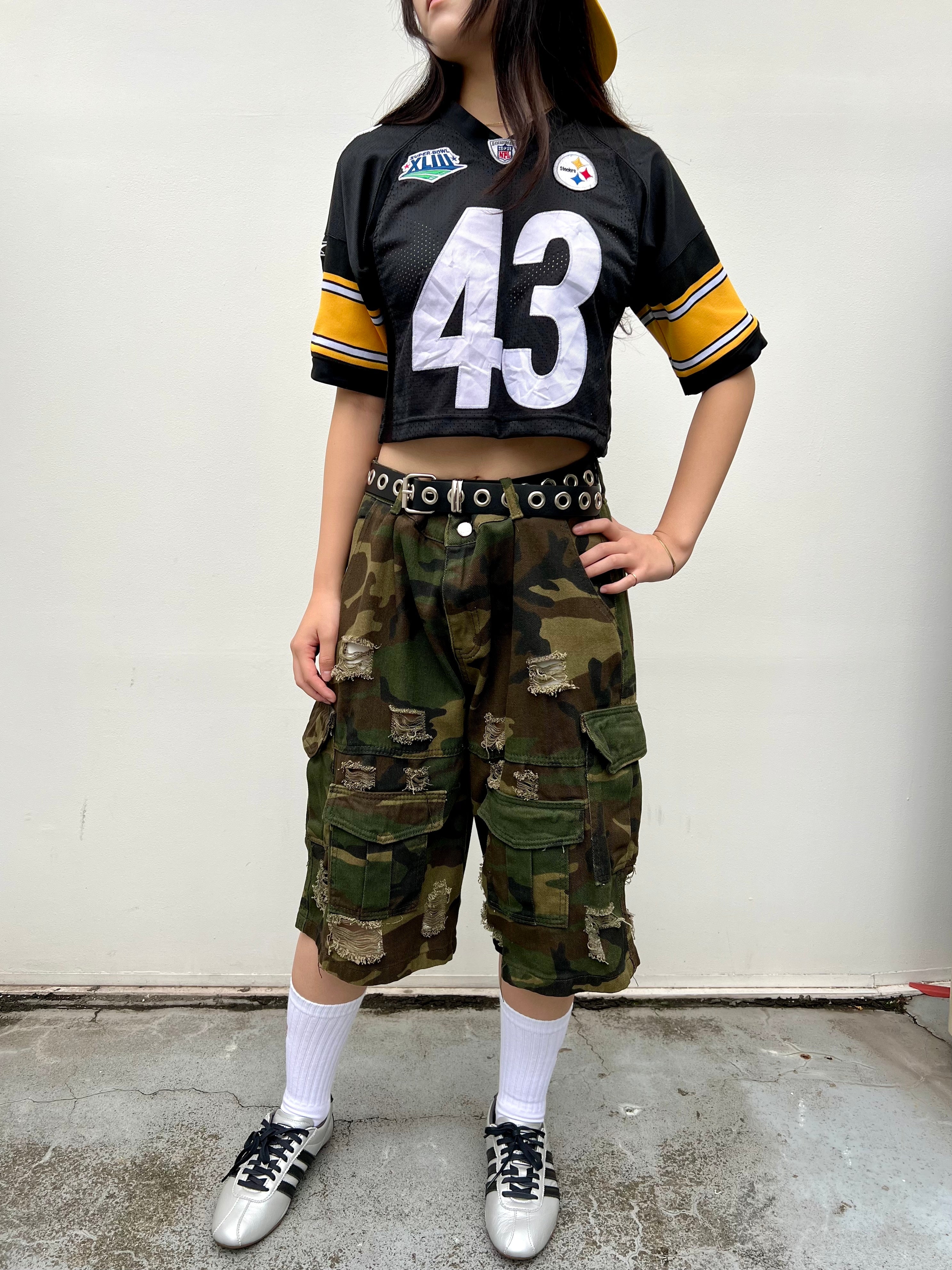 【リメイククロップドユニフォーム】ユニフォームをクロップド使用にリメイクした一点モノ◎NFLチームユニフォームをベースに、クロップド丈へ大胆リメイクしたアイテム。裾を短くカットすることで、ウエストラインをすっきり見せながら、メッシュ素材ならではの通気性と軽やかさを活かしたデザインです。フロントのナンバリングやチームパッチが存在感を放ち、一枚でストリートムードを引き立てます。