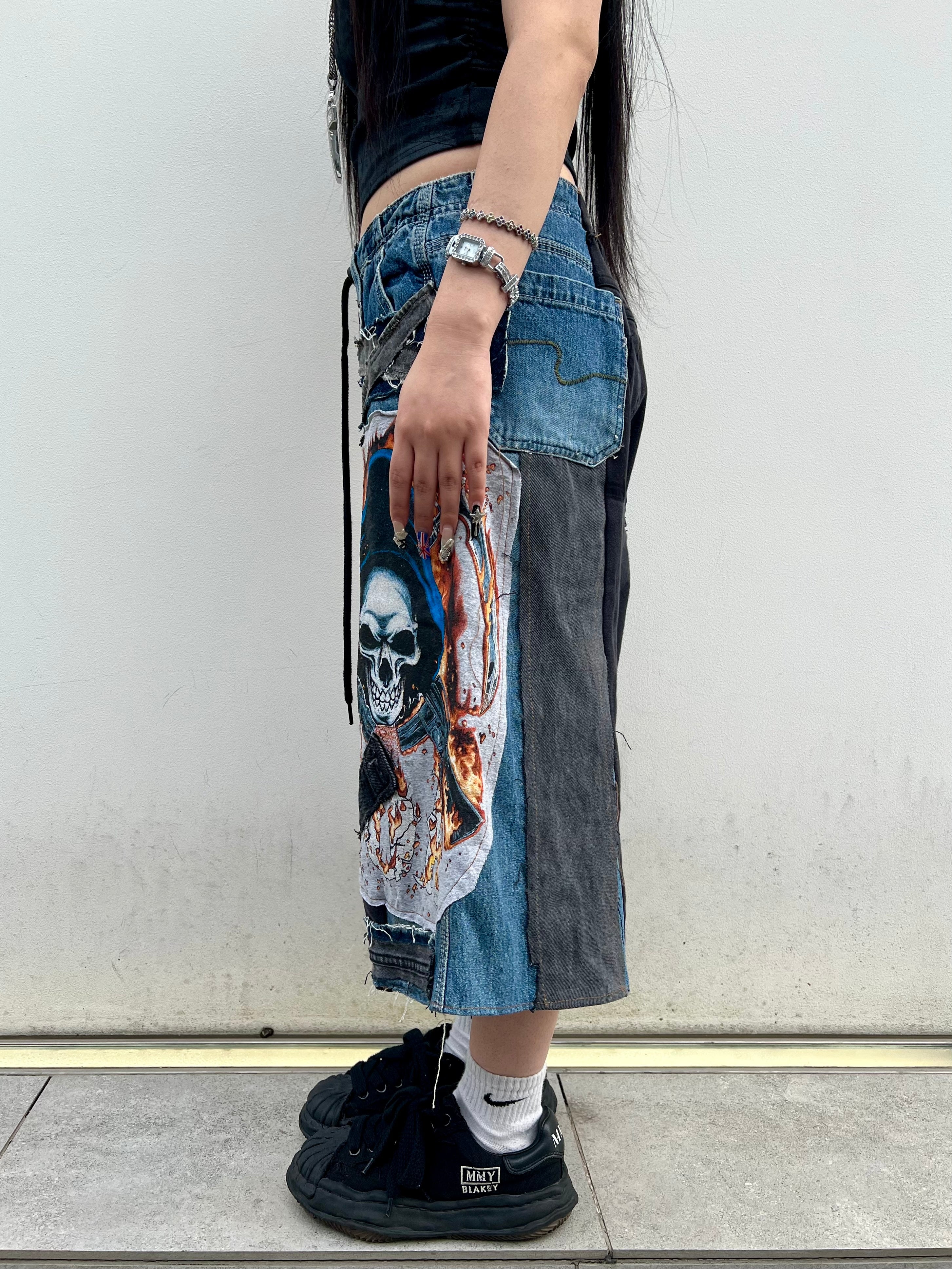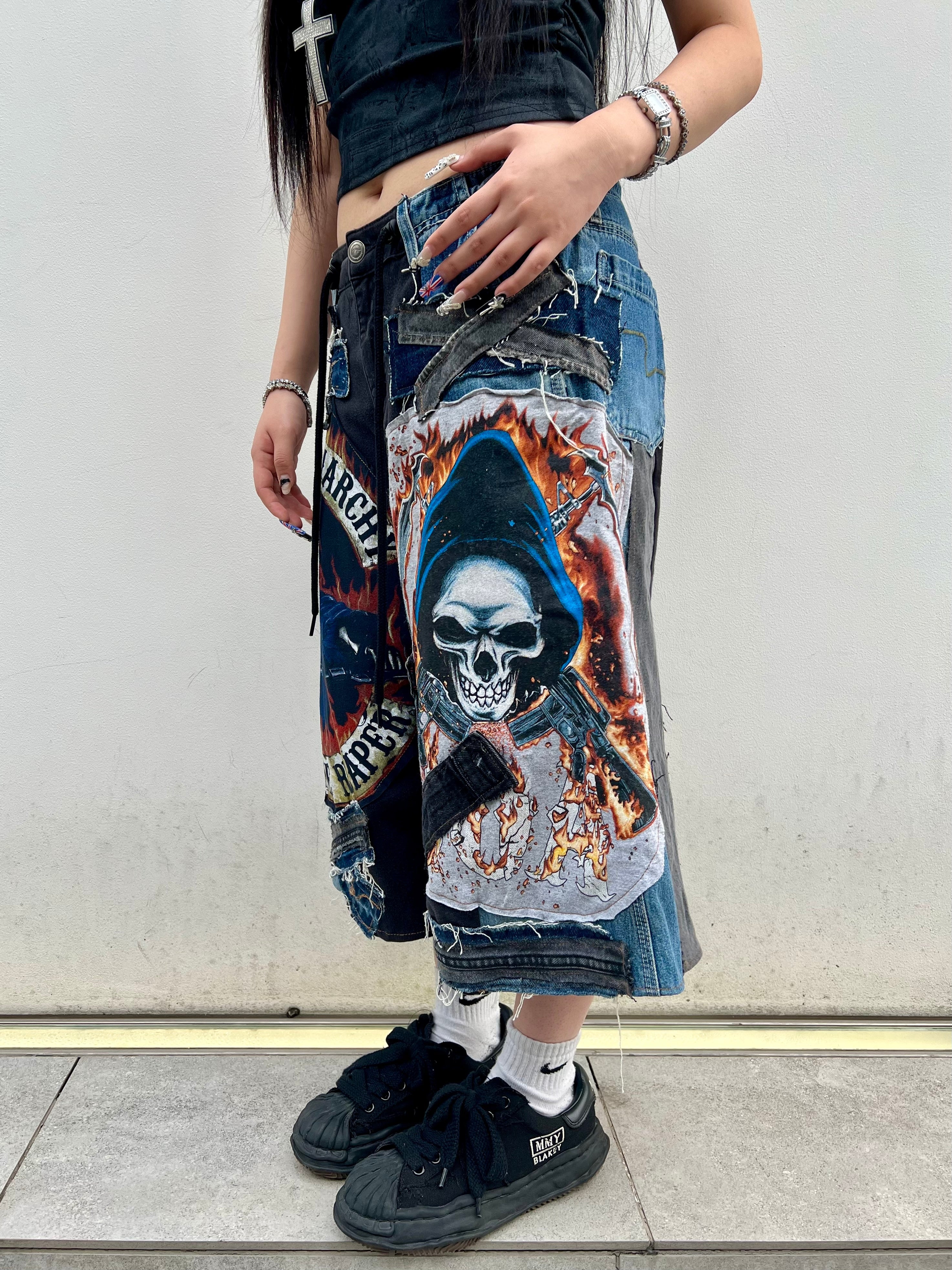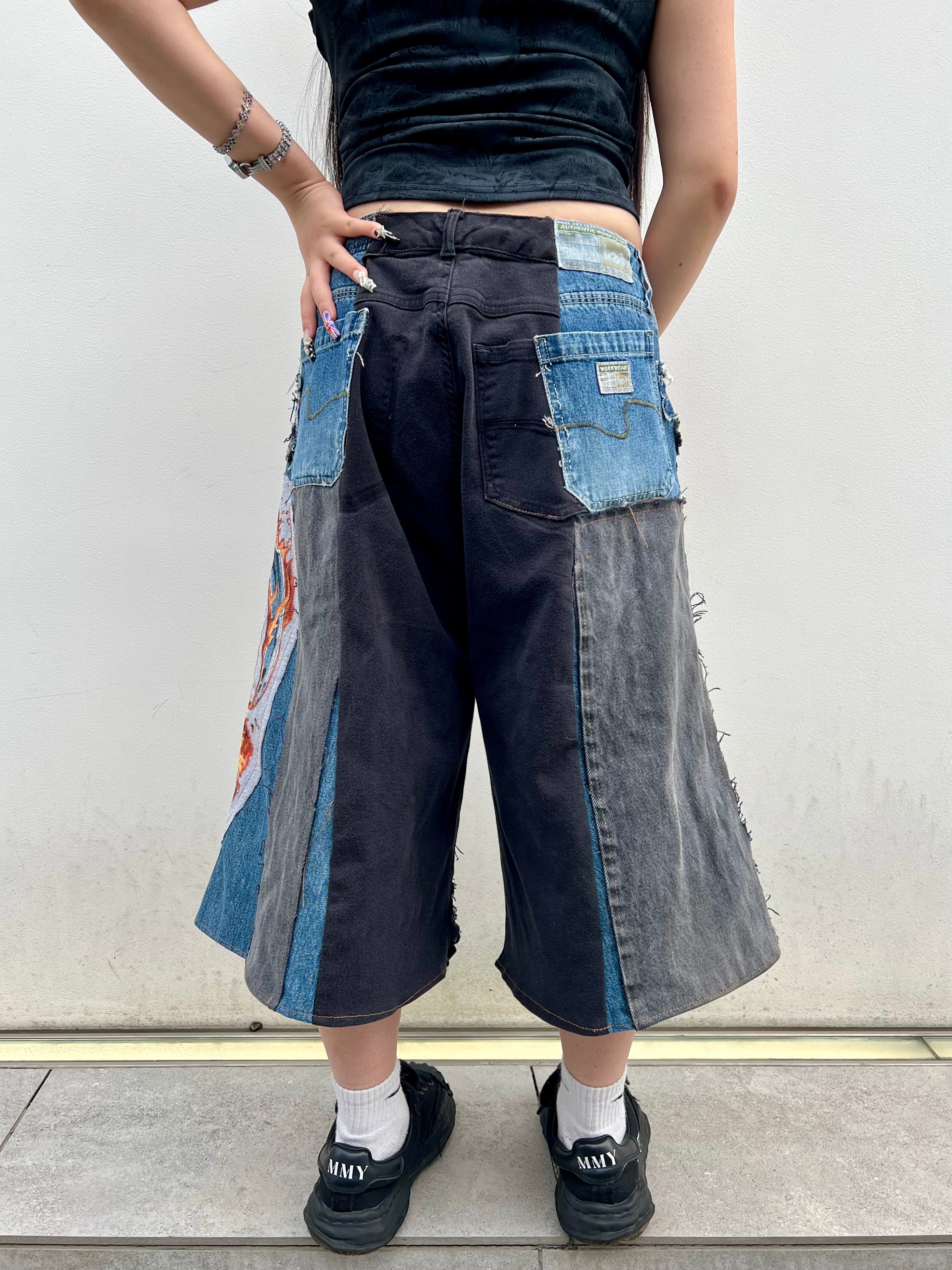 個性的なストリートスタイルを演出するリメイクデニムショーツ。