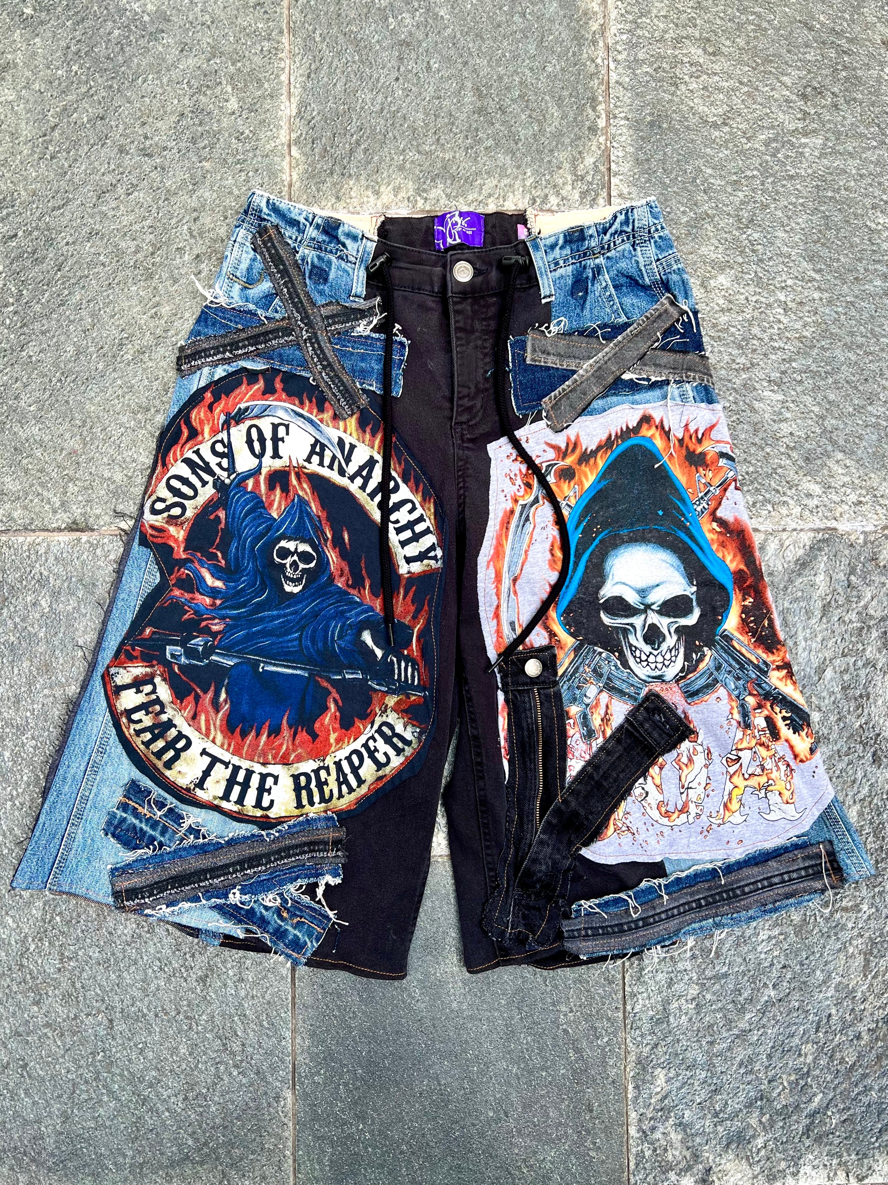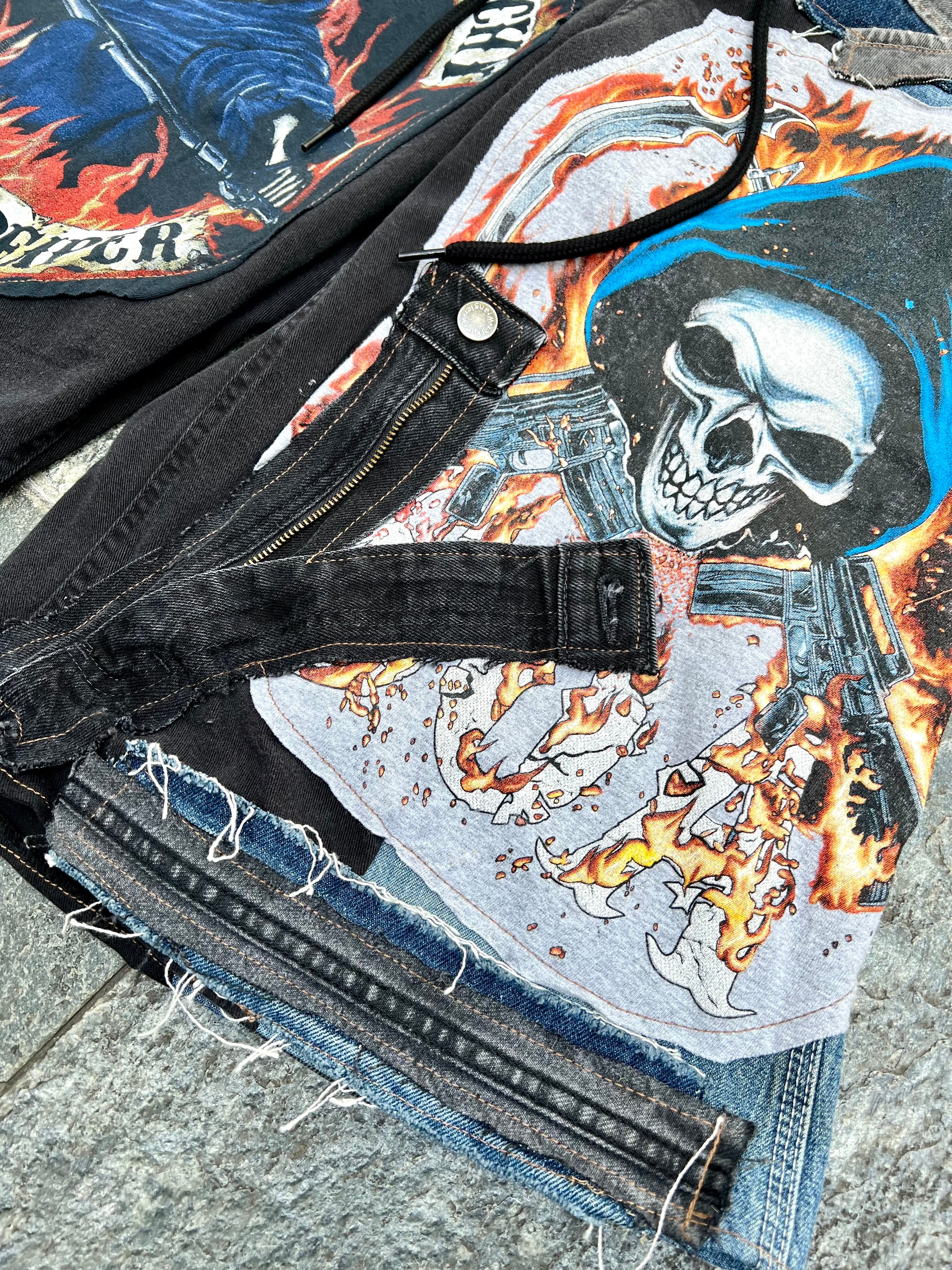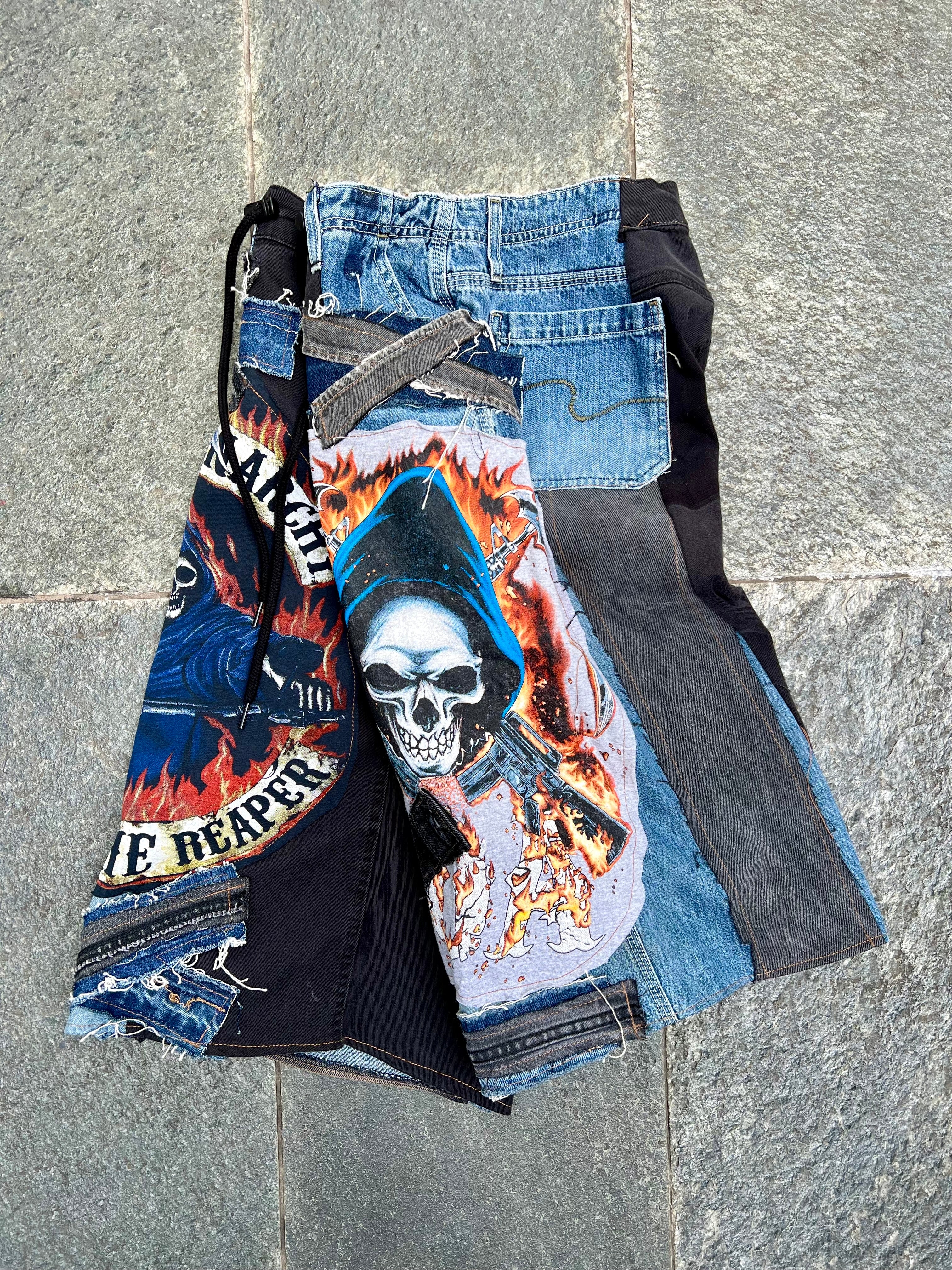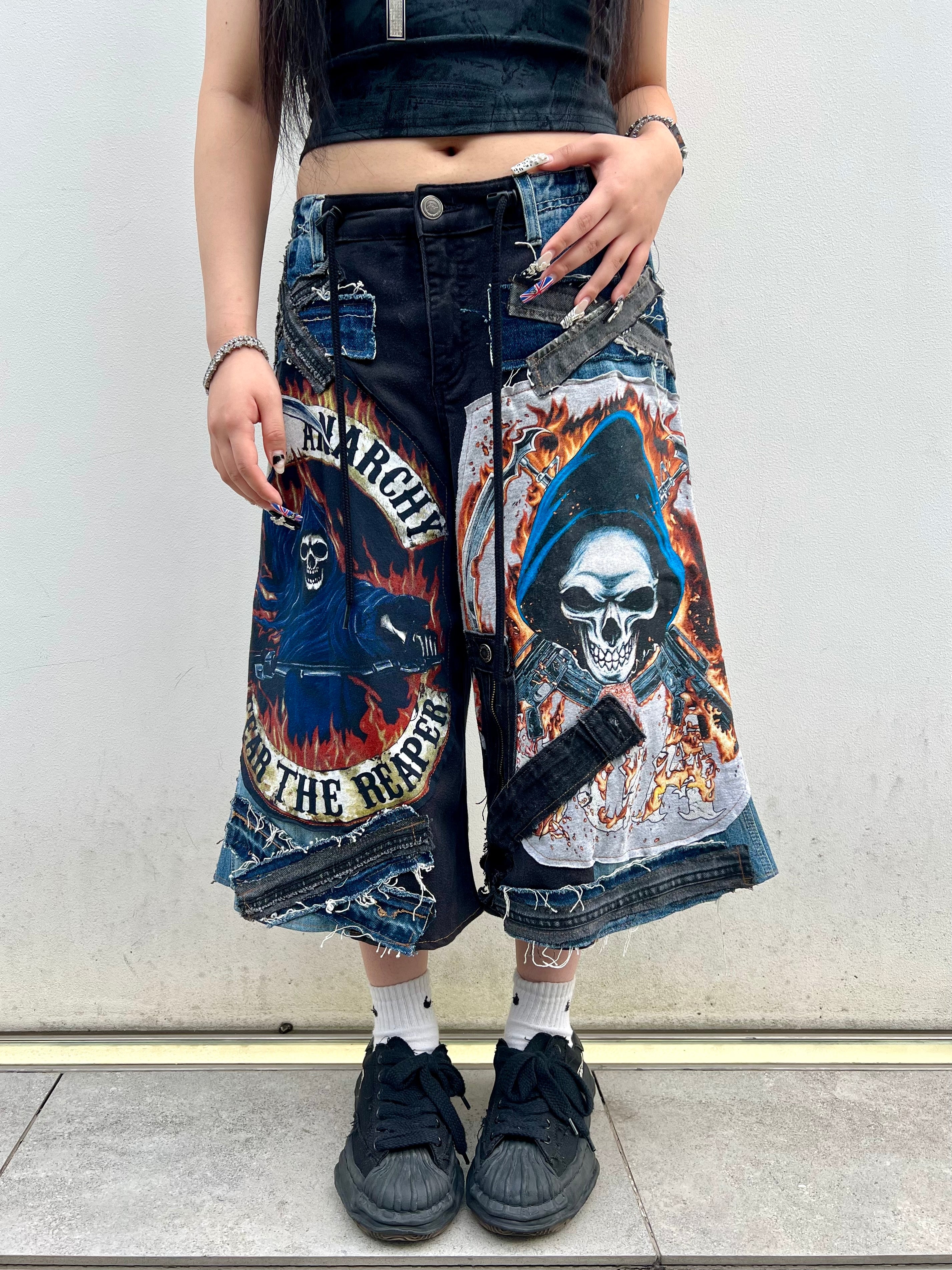 個性的なストリートスタイルを演出するリメイクデニムショーツ。