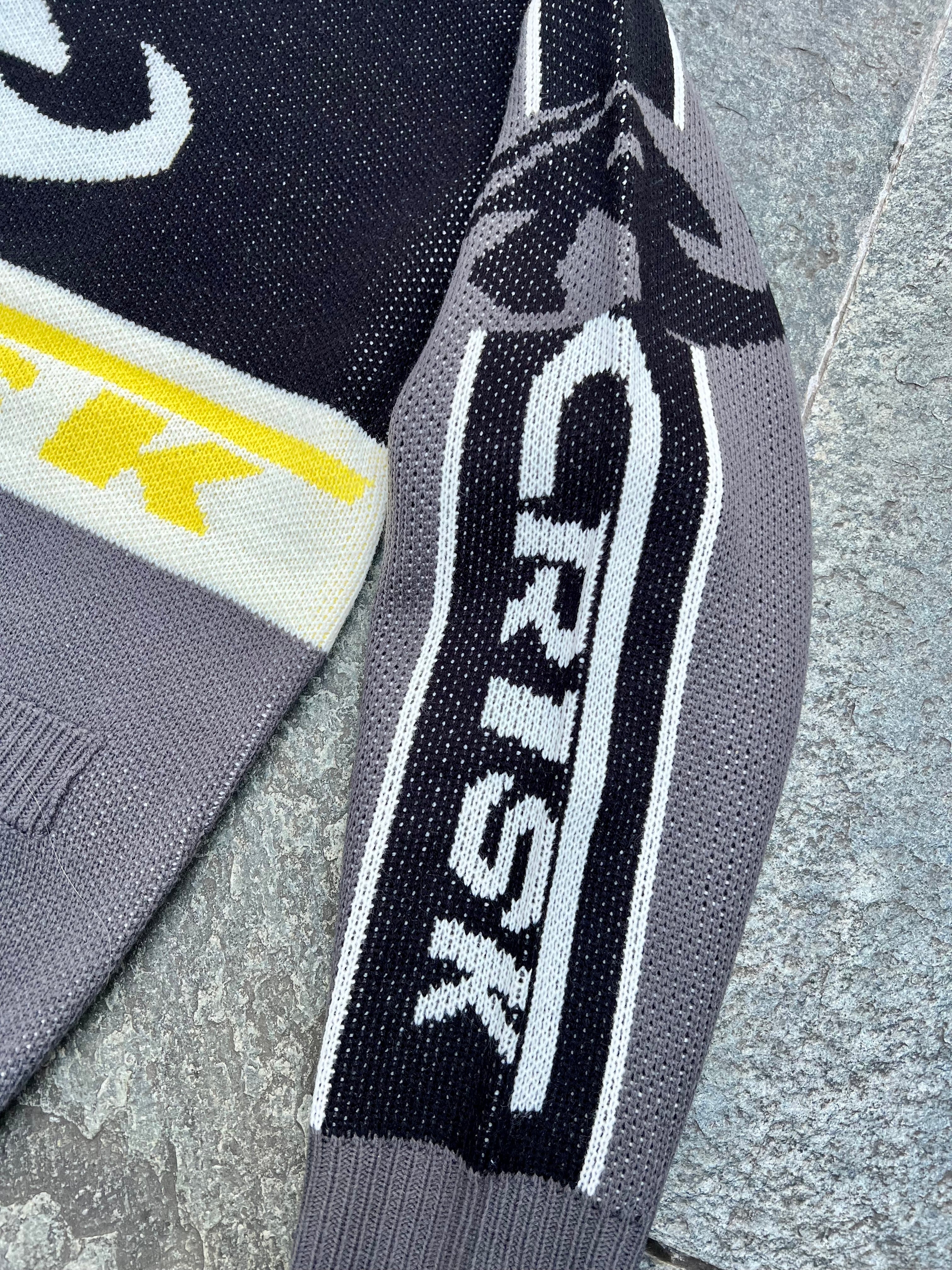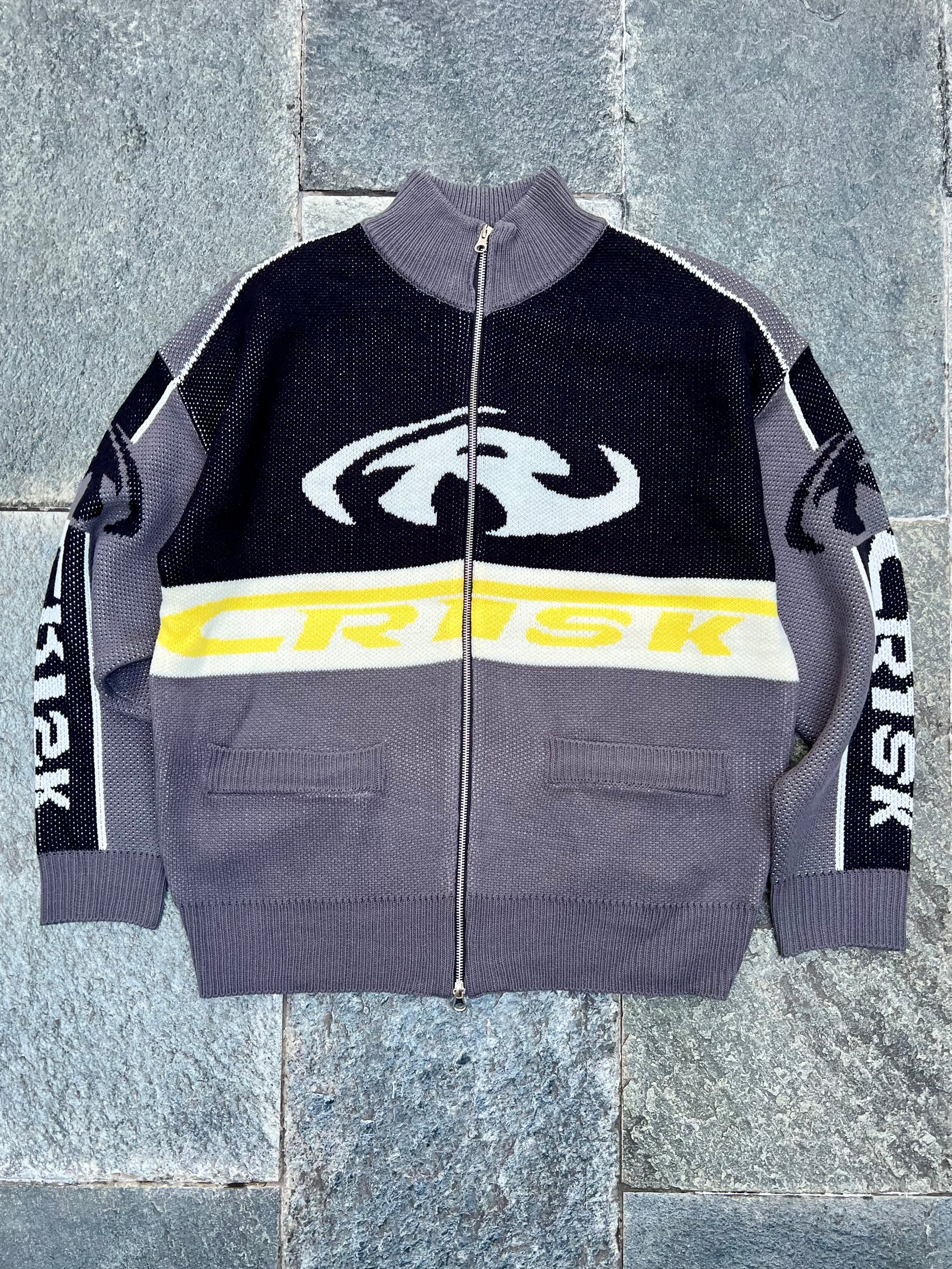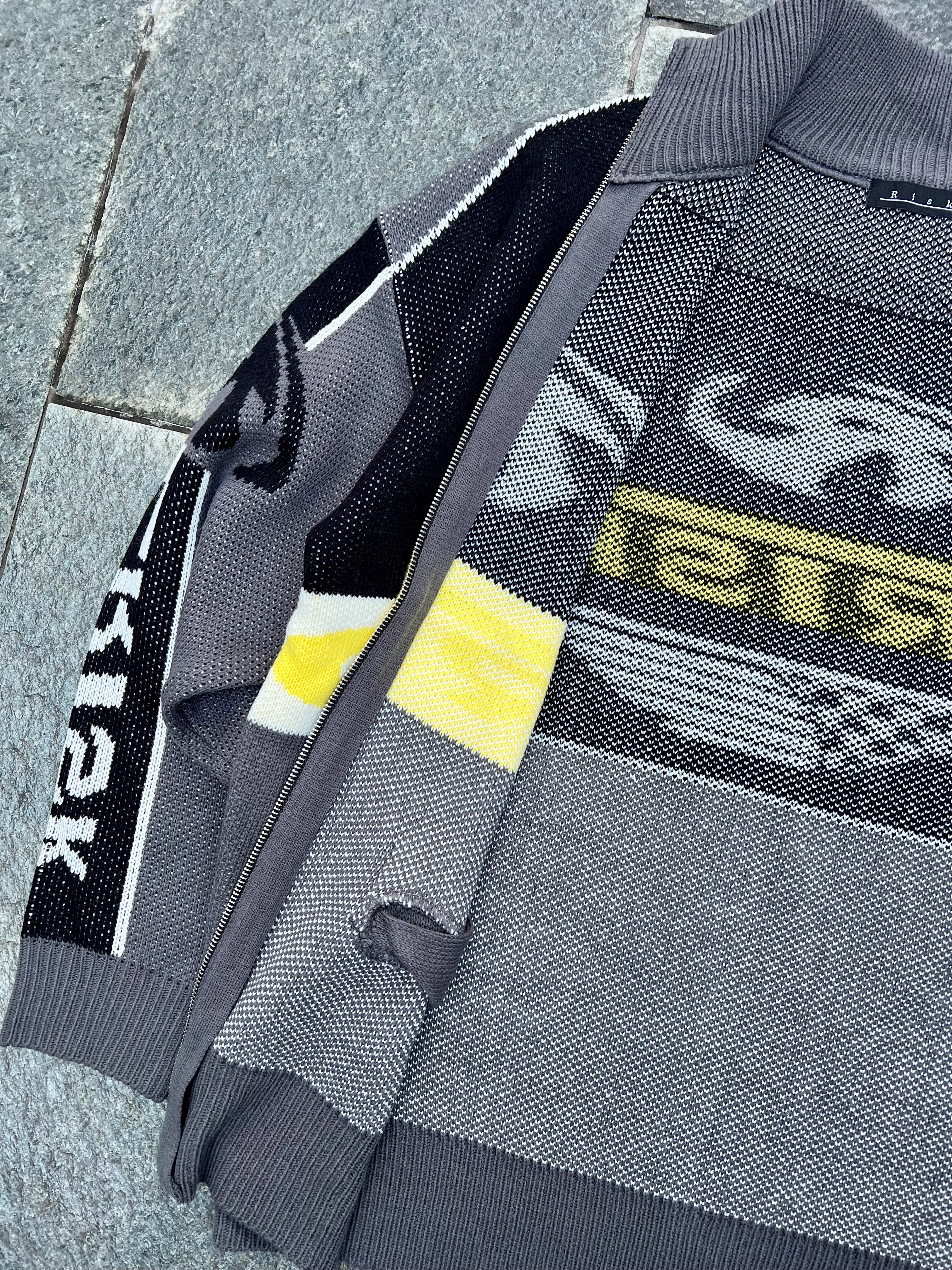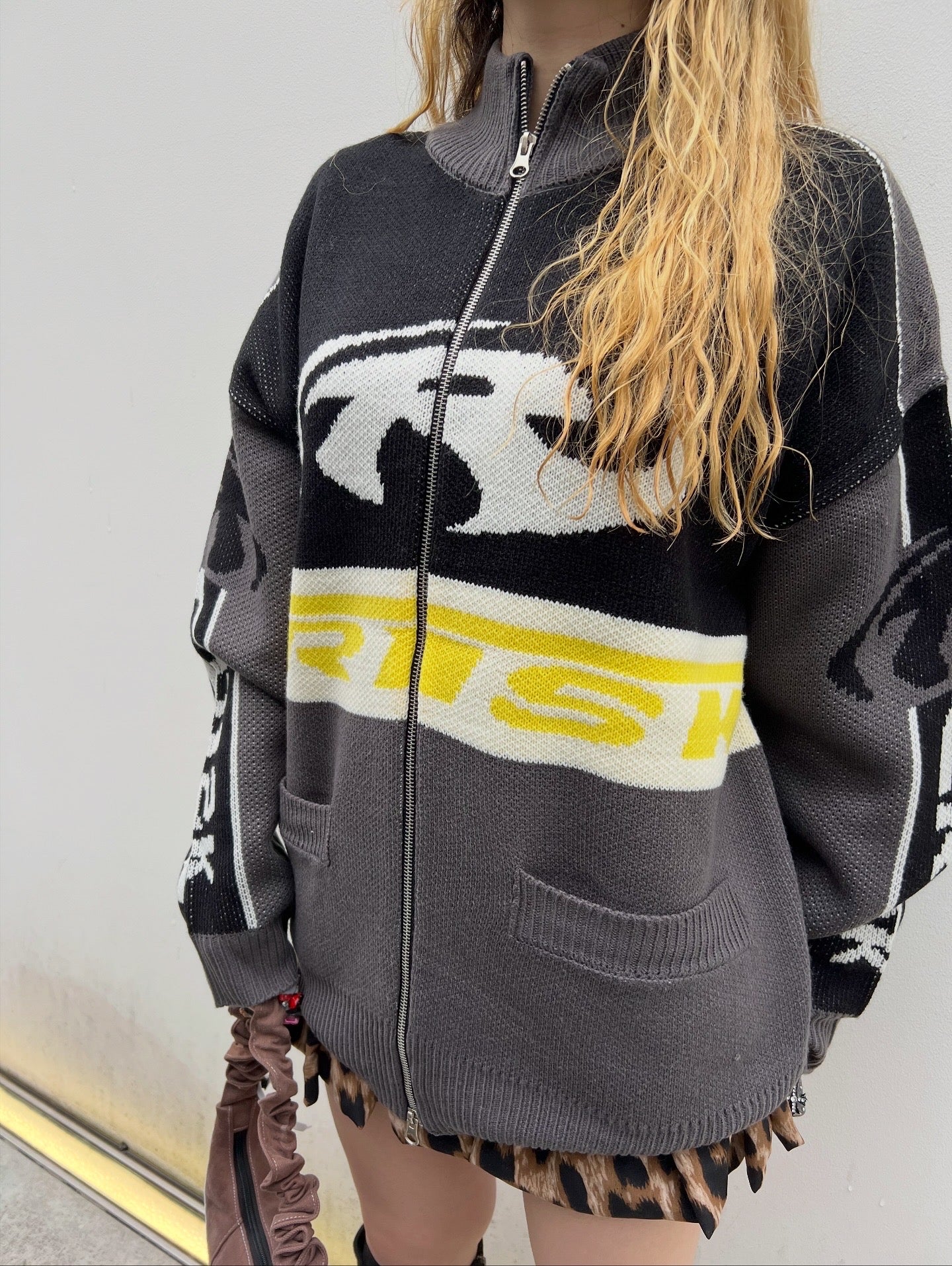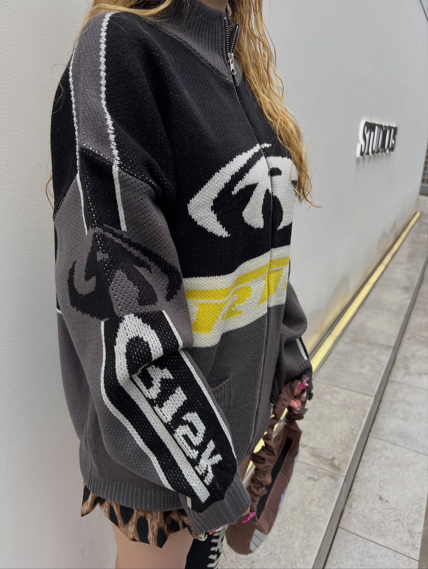 フロントと袖に大胆なロゴデザインを配したジップアップニットジャケット。厚手の編み地で保温性が高く、ストリート感のあるルーズシルエットが魅力。カジュアルにもモードにも合わせやすい一着