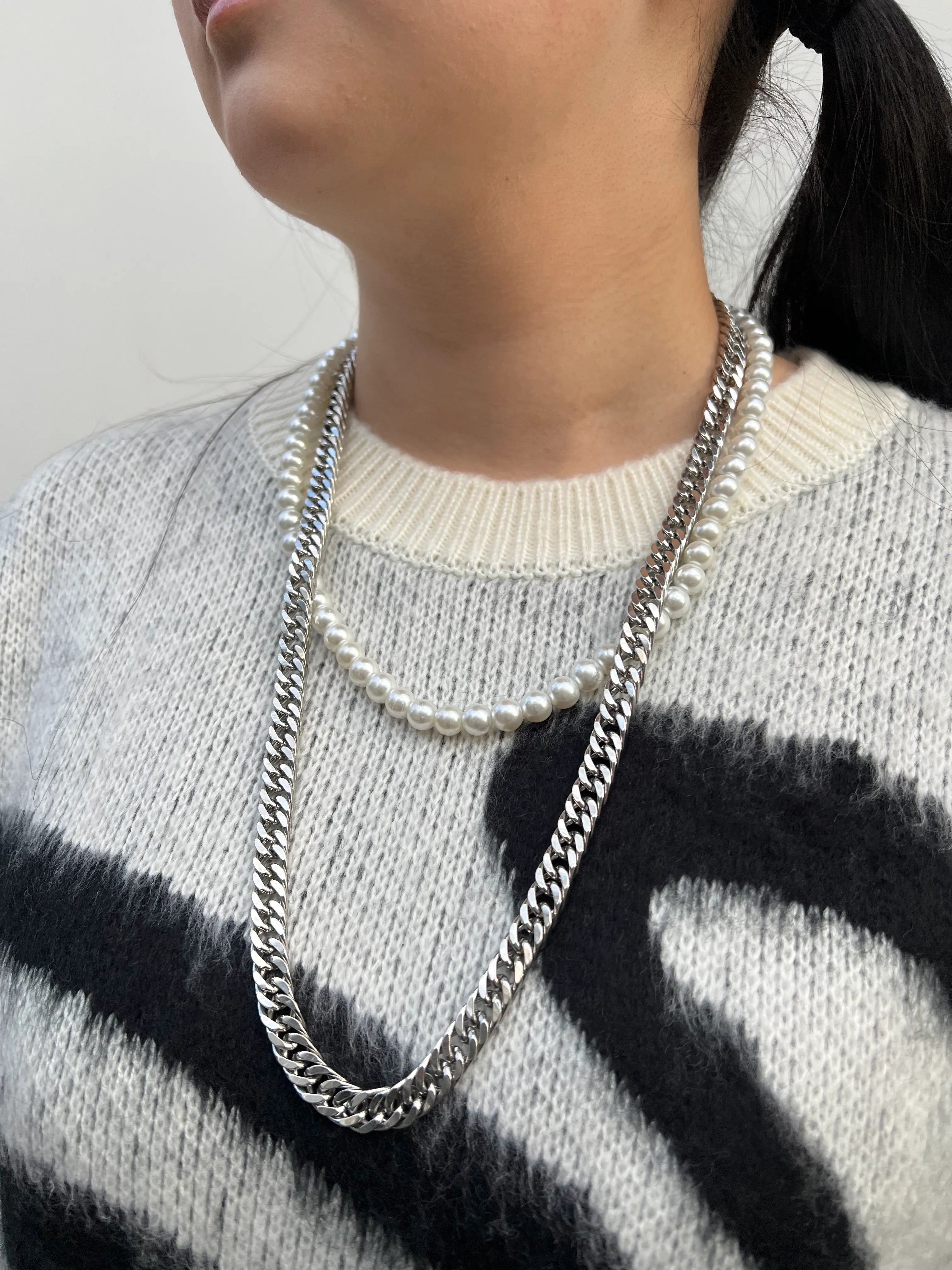 ・パールとチェーンを組み合わせたトレンド感あるデザイン。・上品さと無骨さが絶妙にミックスされたユニセックス仕様。・どんな服装にも馴染むバランスの良い長さ。・一つ着けるだけでスタイリングが華やぐ主役アクセ。・シルバーチェーンの輝きが顔周りを明るく見せる。
