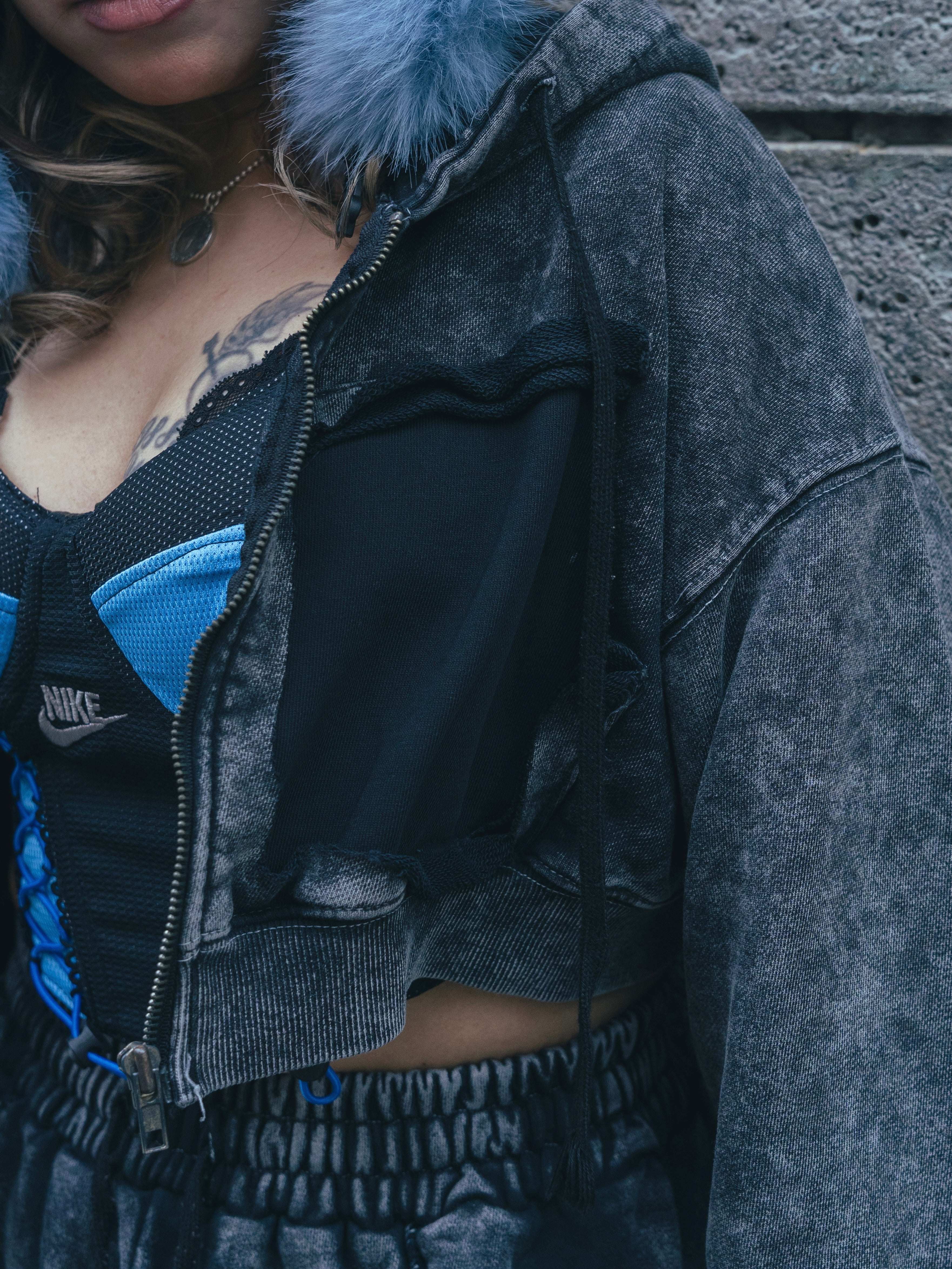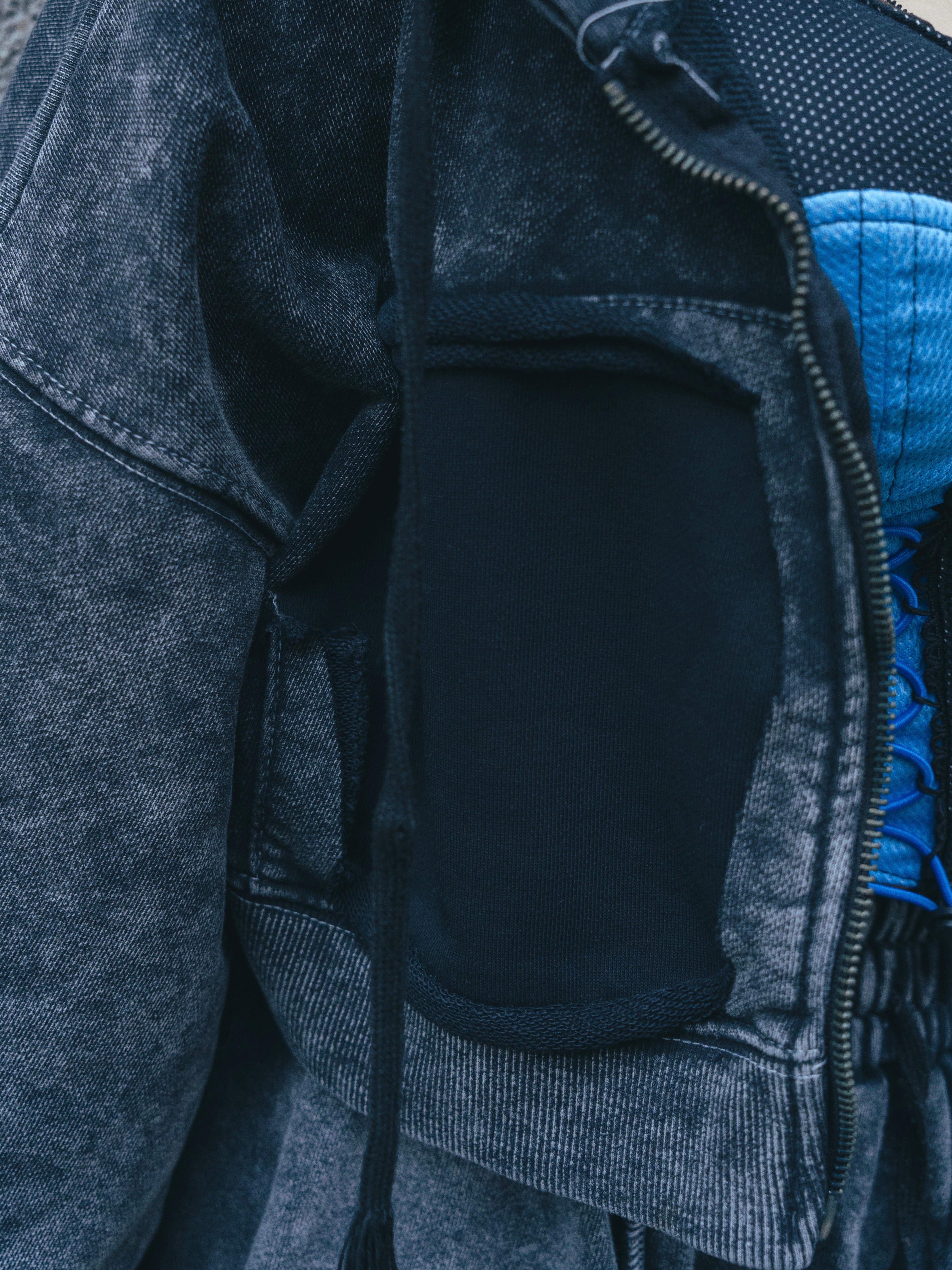 フロントには異素材切替のポケットを配置し、デザイン性と実用性を両立。