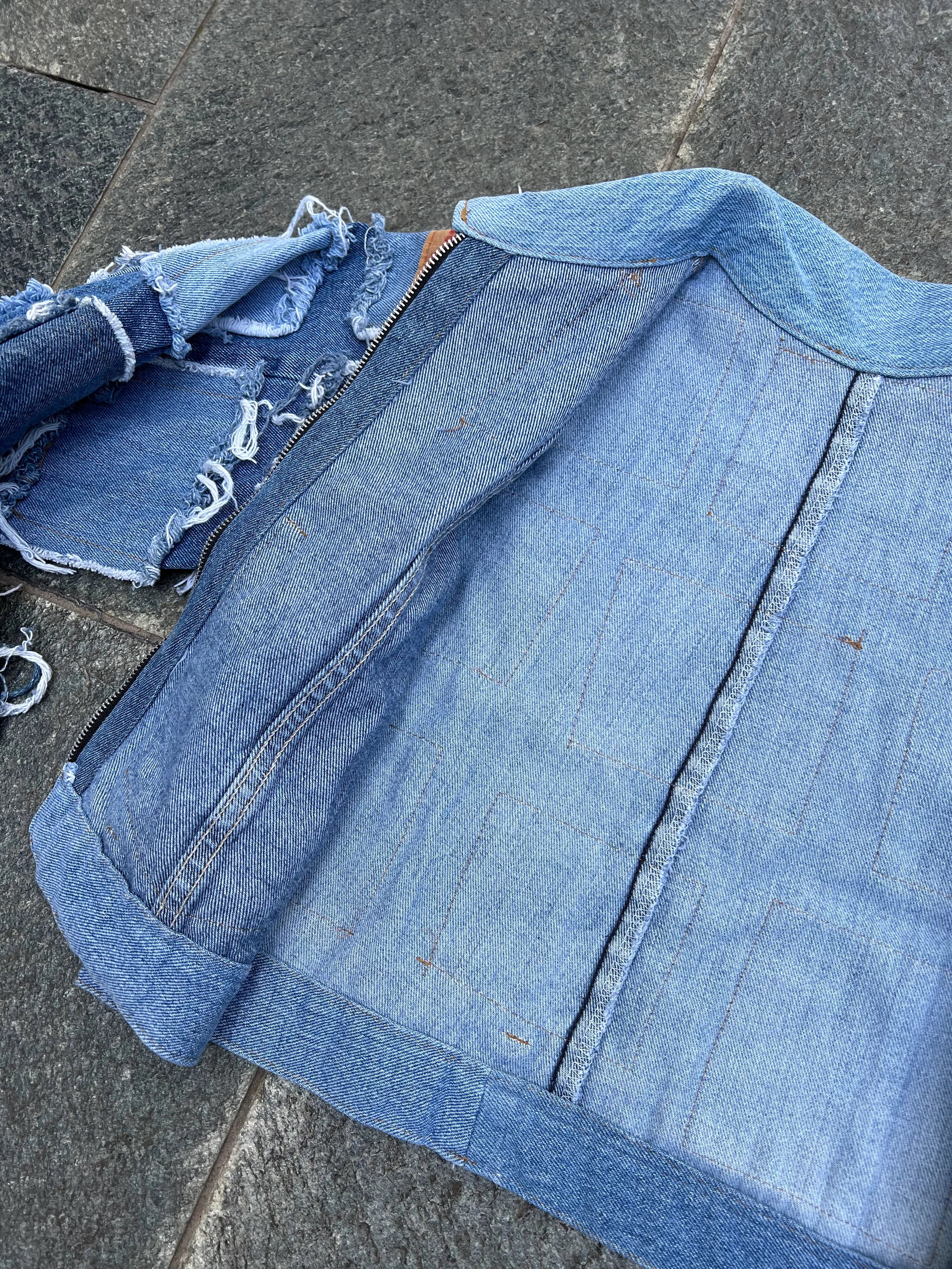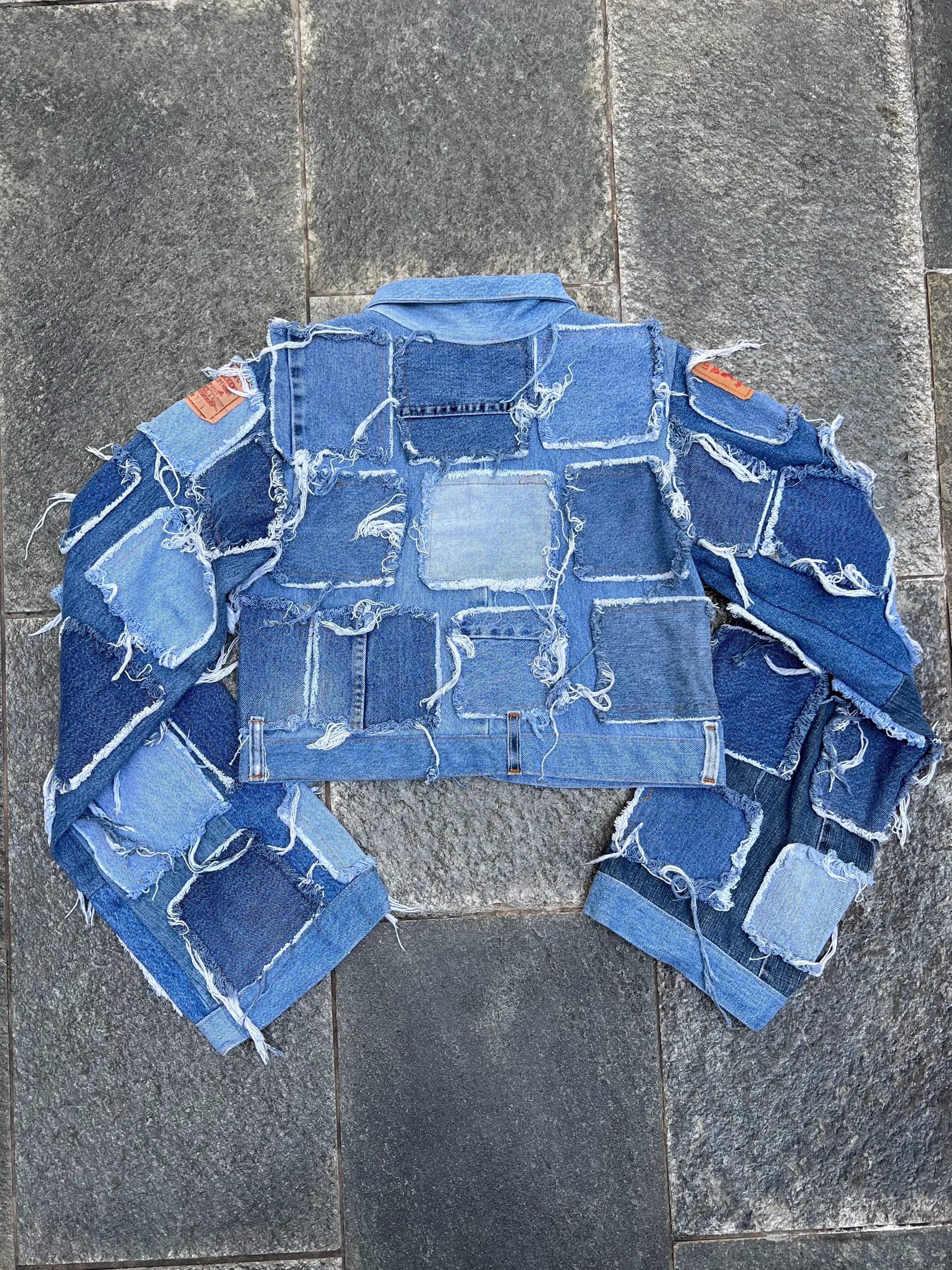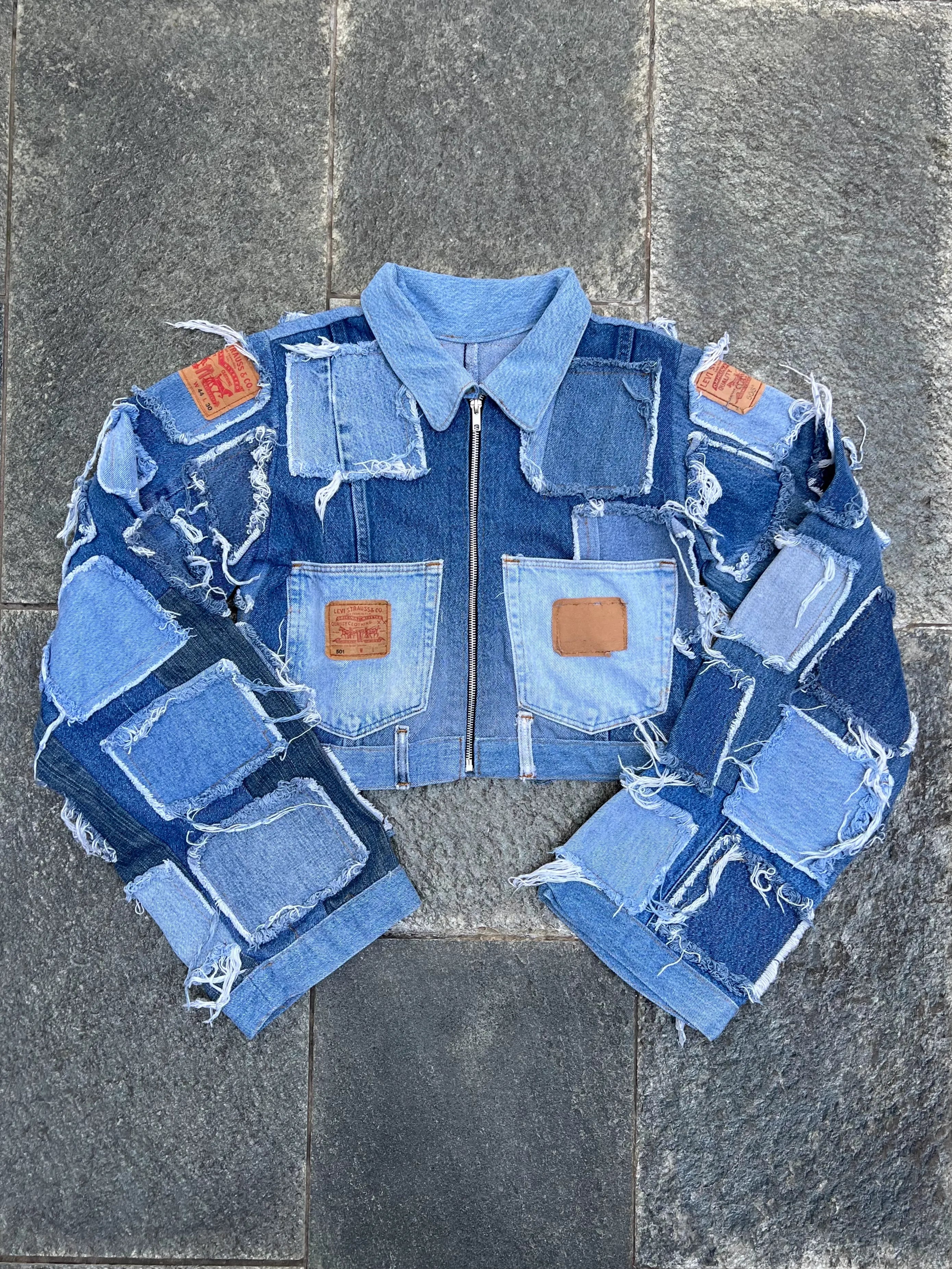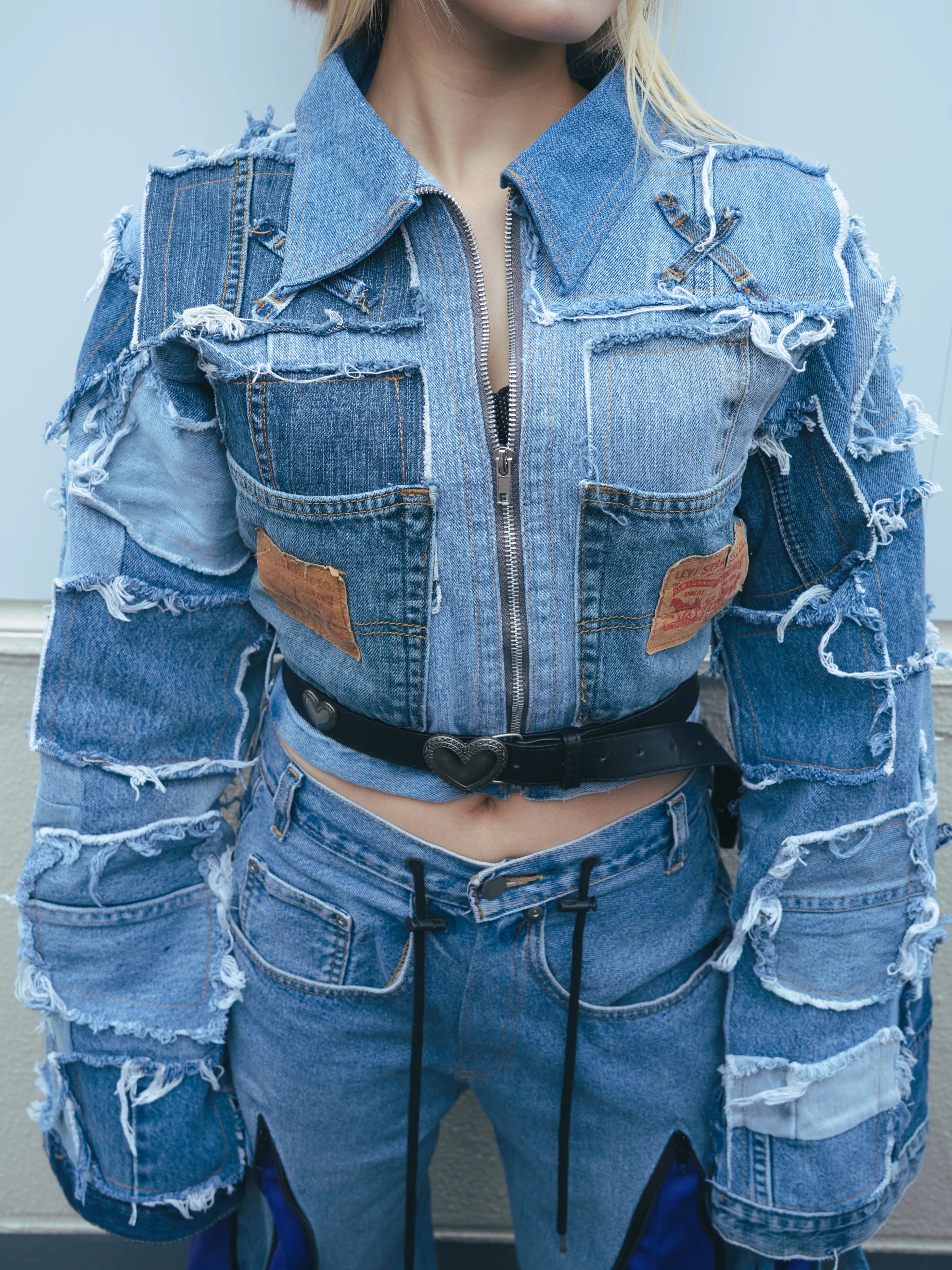 ヴィンテージ感のある複数のデニム生地を組み合わせたパッチワークデザインが特徴のクロップドジャケット。フリンジや色落ち具合の違いが一枚一枚に表情を与え、リメイクならではの特別感を演出します。ショート丈のシルエットはスタイルアップ効果もあり、羽織るだけでコーディネートを一気にモードに仕上げてくれる主役級アイテム。