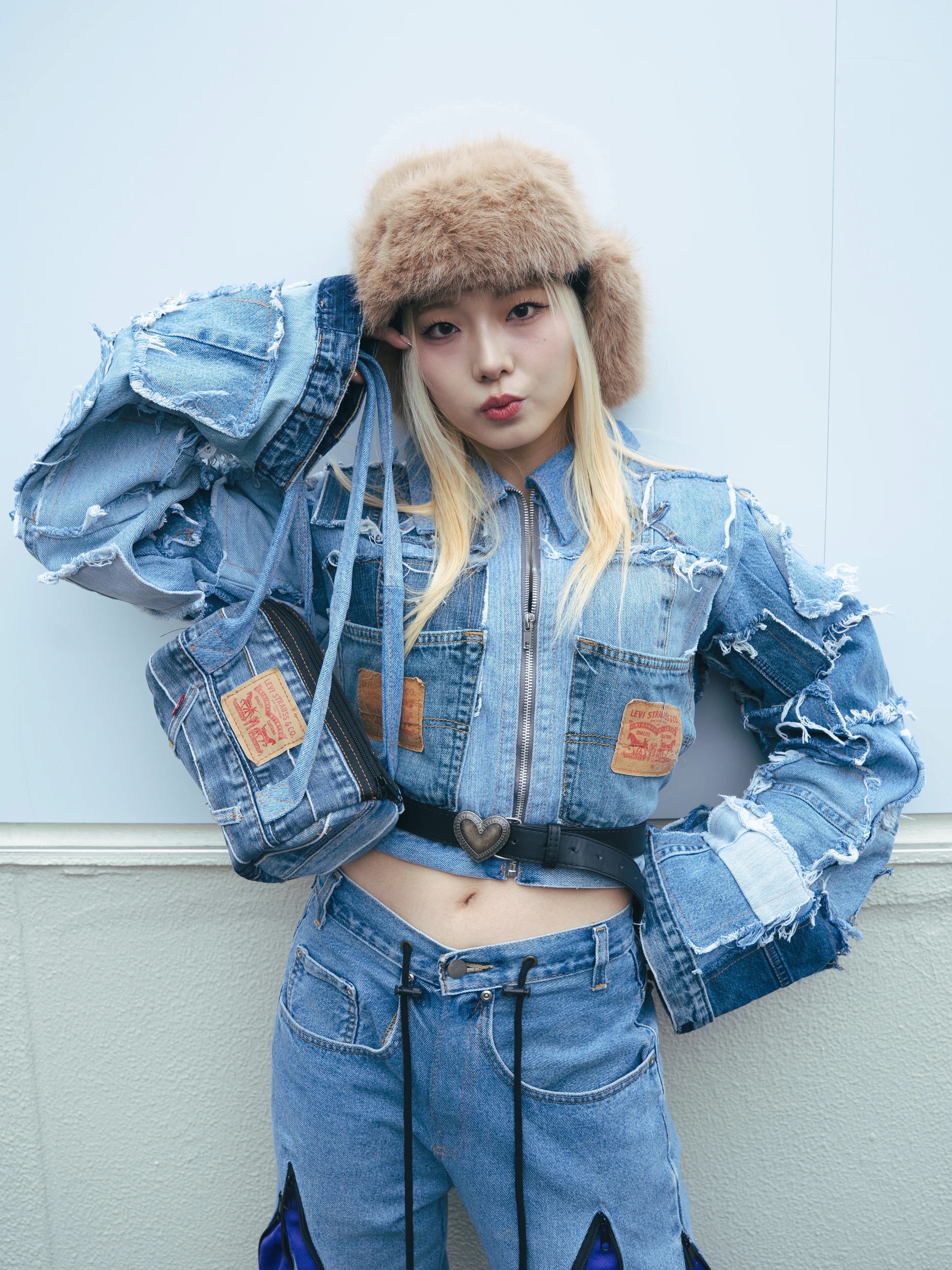 シンプルなタンクトップやチューブトップに合わせれば、ジャケットのデザインが際立つバランスに。ローライズデニムやミニスカートとのY2Kムード漂うスタイルもおすすめ。足元は厚底ブーツやスニーカーでストリートライクに仕上げると、存在感抜群のトレンドコーデが完成します。
