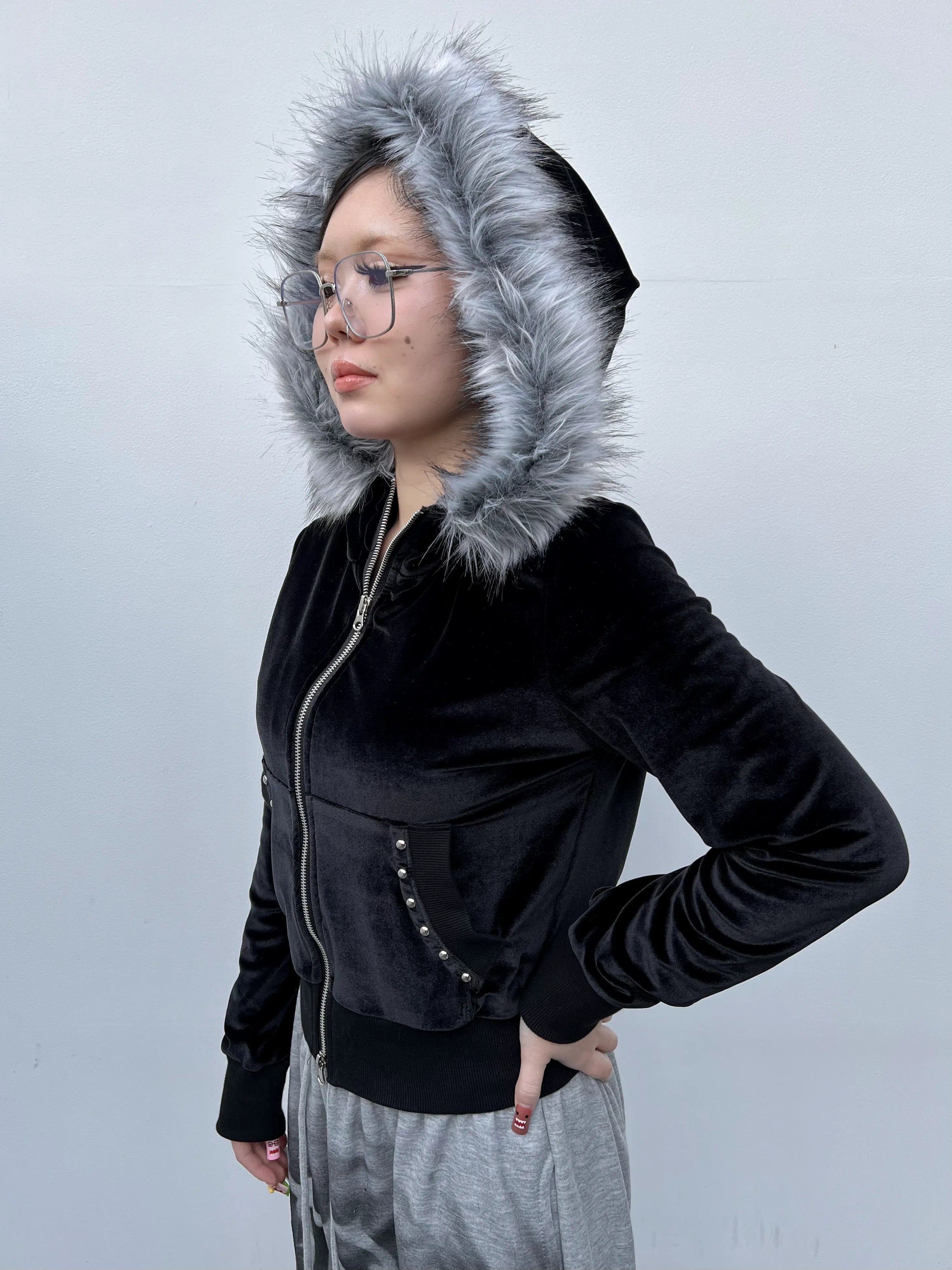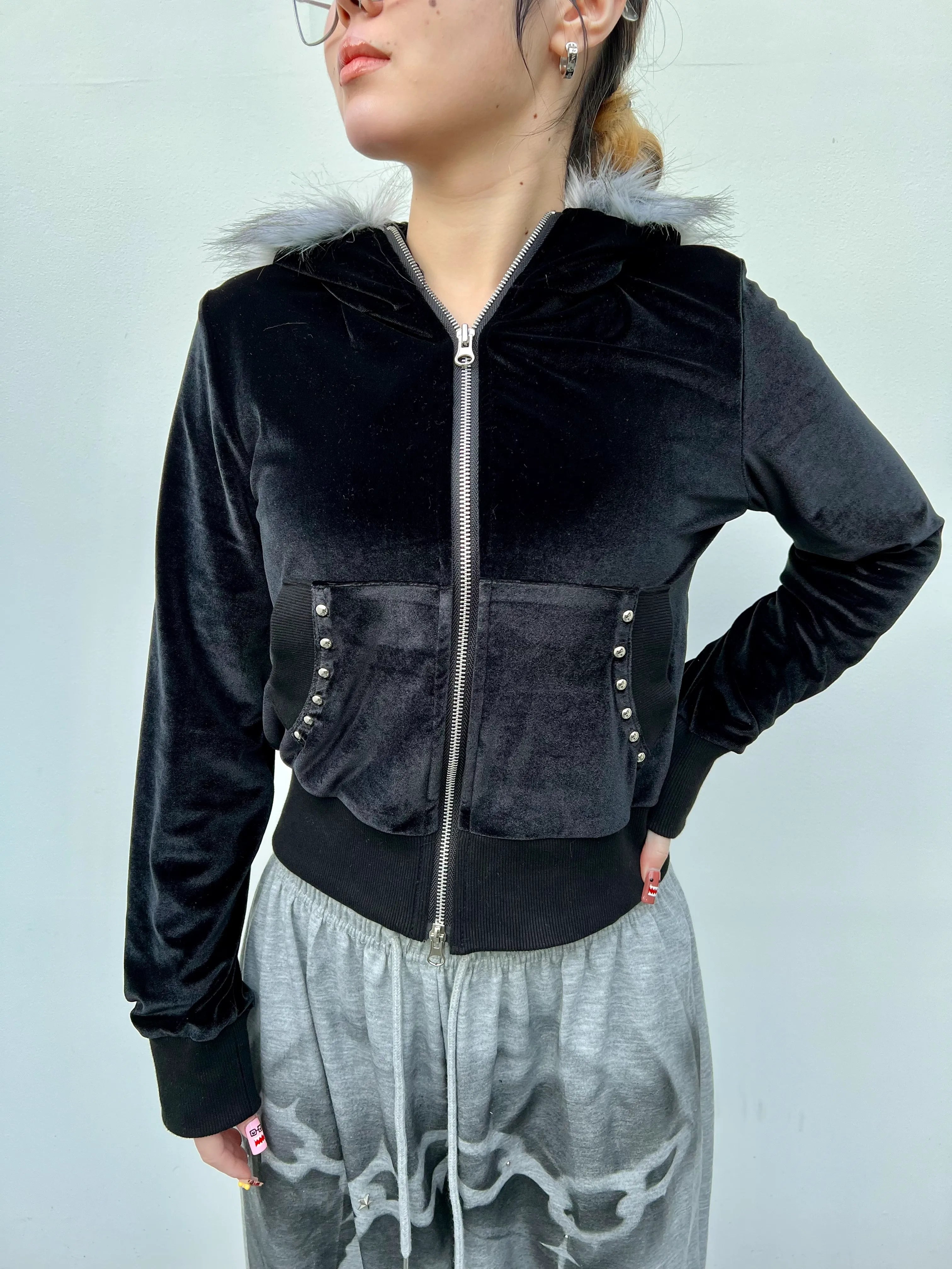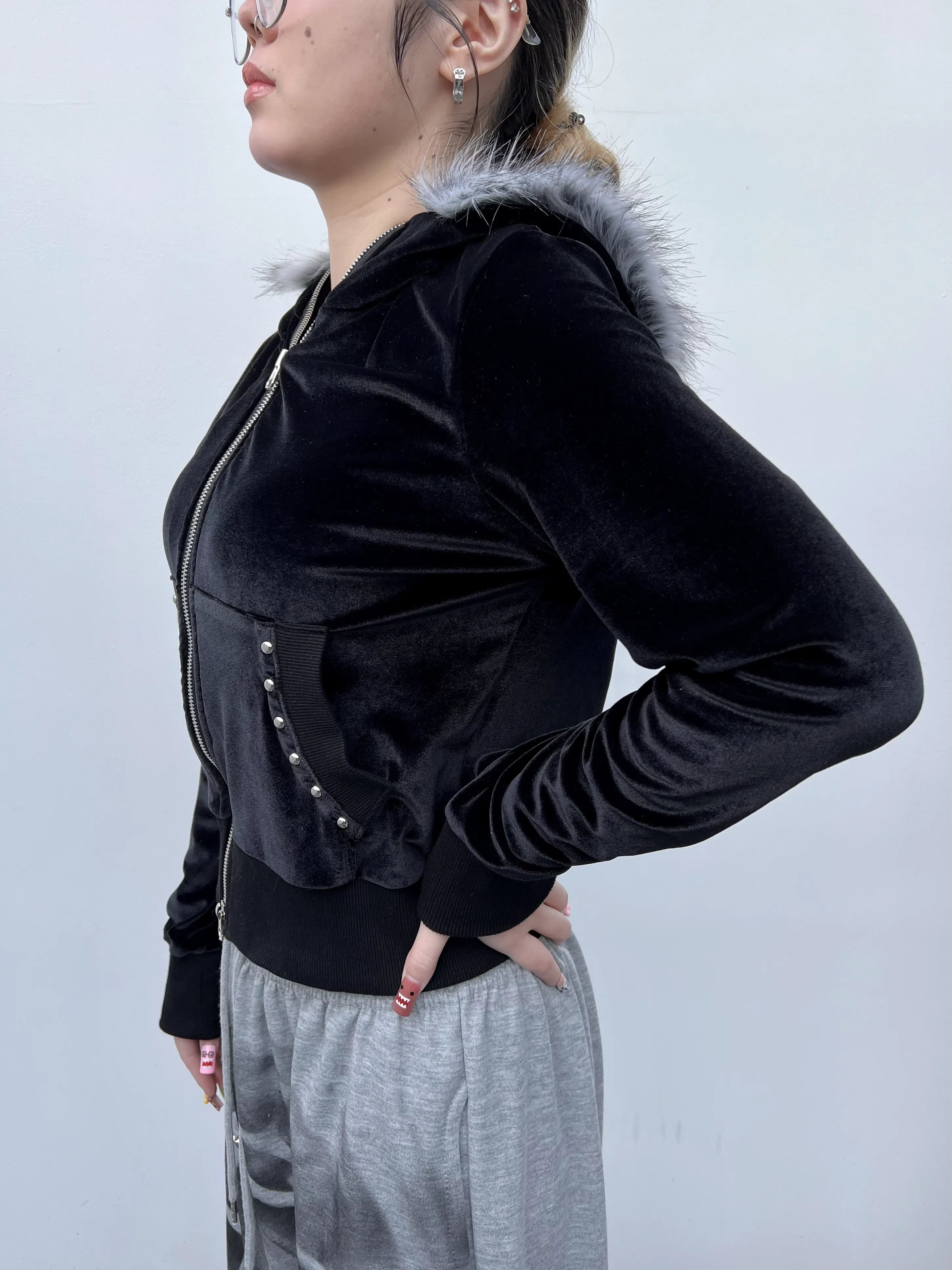 【POINT】⚫︎高級感のあるベロア×ファーデザイン 光沢のあるベロアと柔らかいフェイクファーのコンビでリッチな表情に。⚫︎ジップアップで着こなし幅が広い インナー調整や羽織りとしても使える万能タイプ。⚫︎スタッズ付きフロントでY2K感UP 細かいディテールがシンプルすぎない “ちょうど良い強さ” を演出。⚫︎しっとり柔らかい着心地のベロア素材 伸縮性もあり快適な着用感。