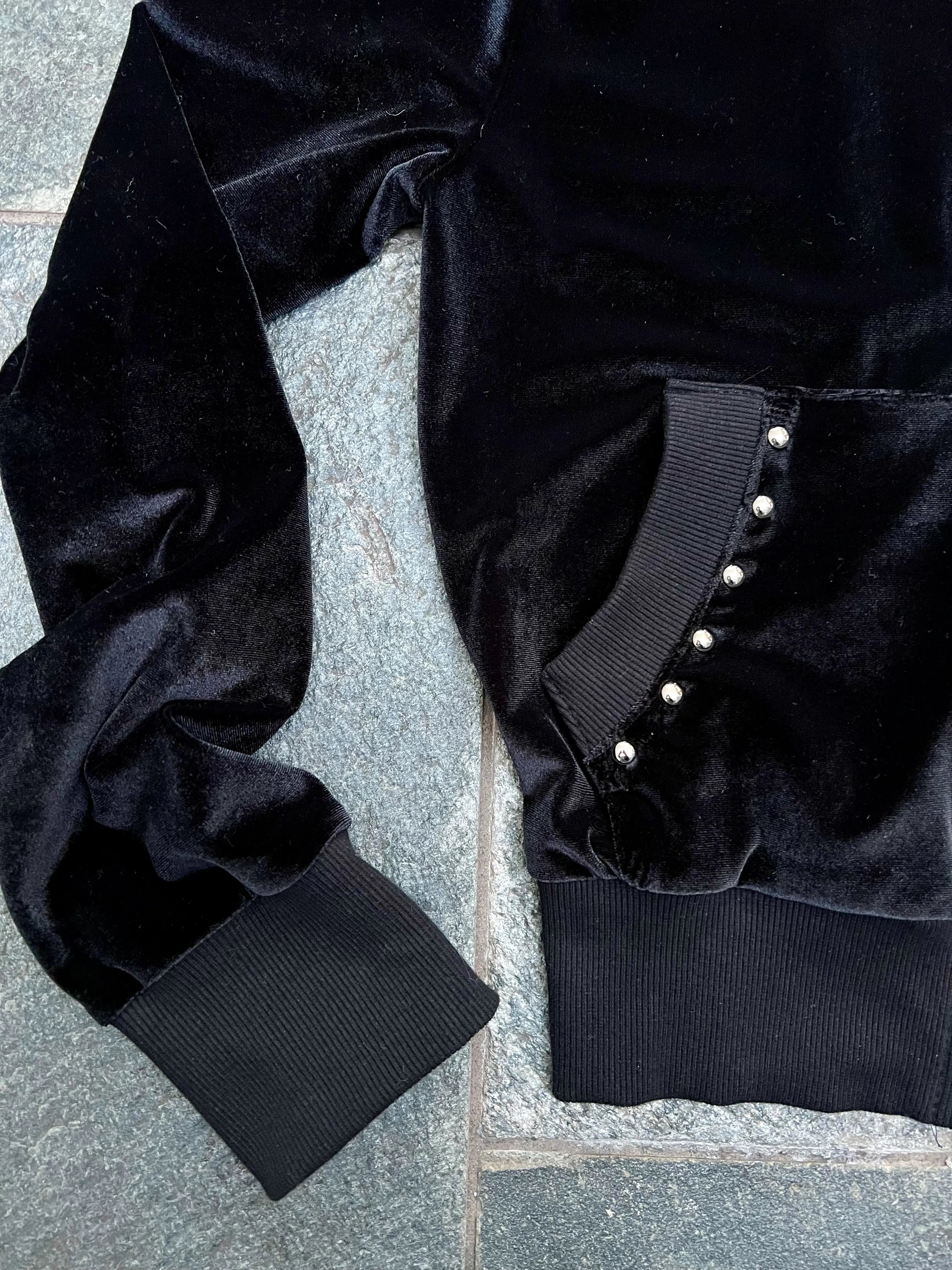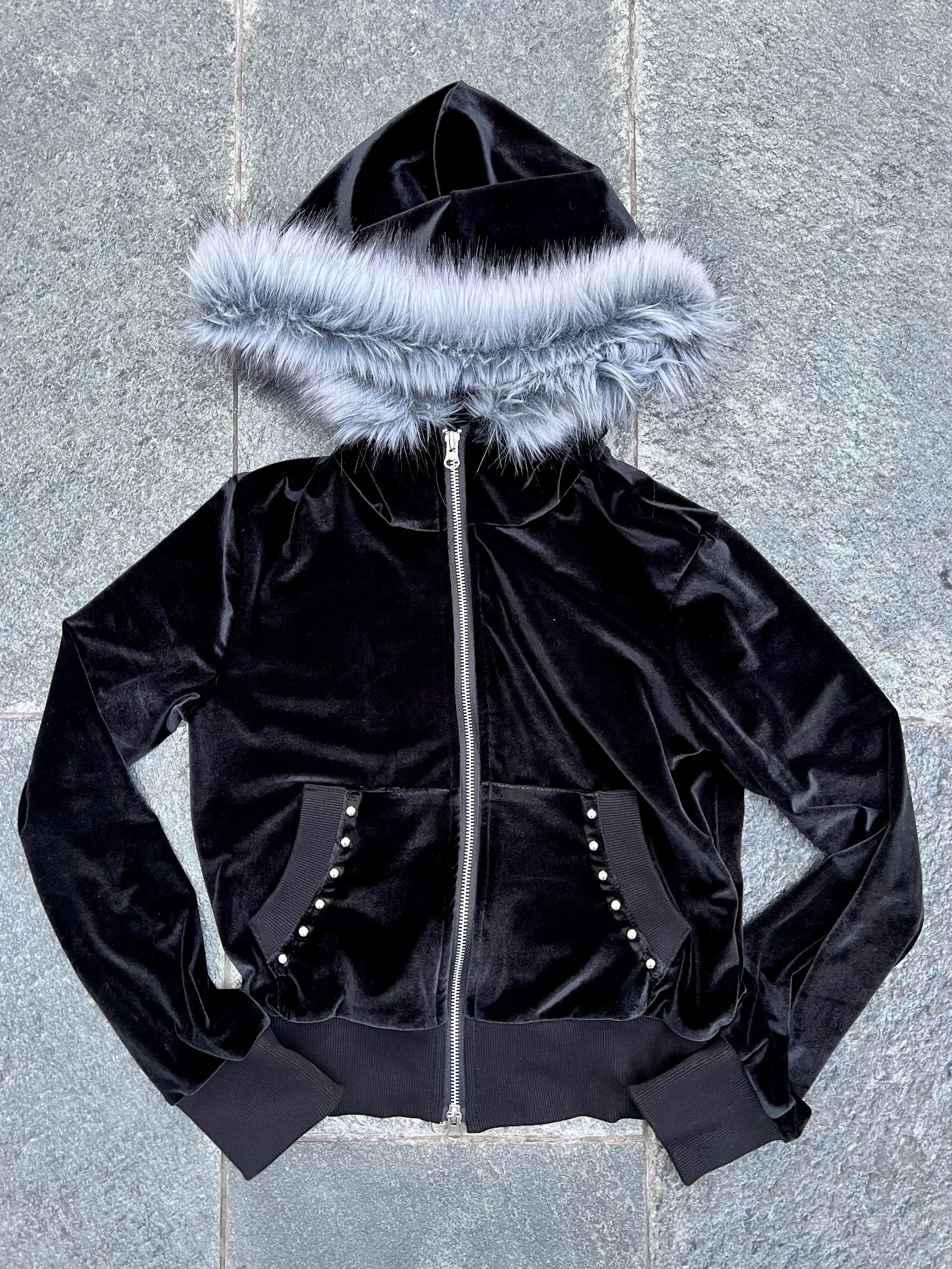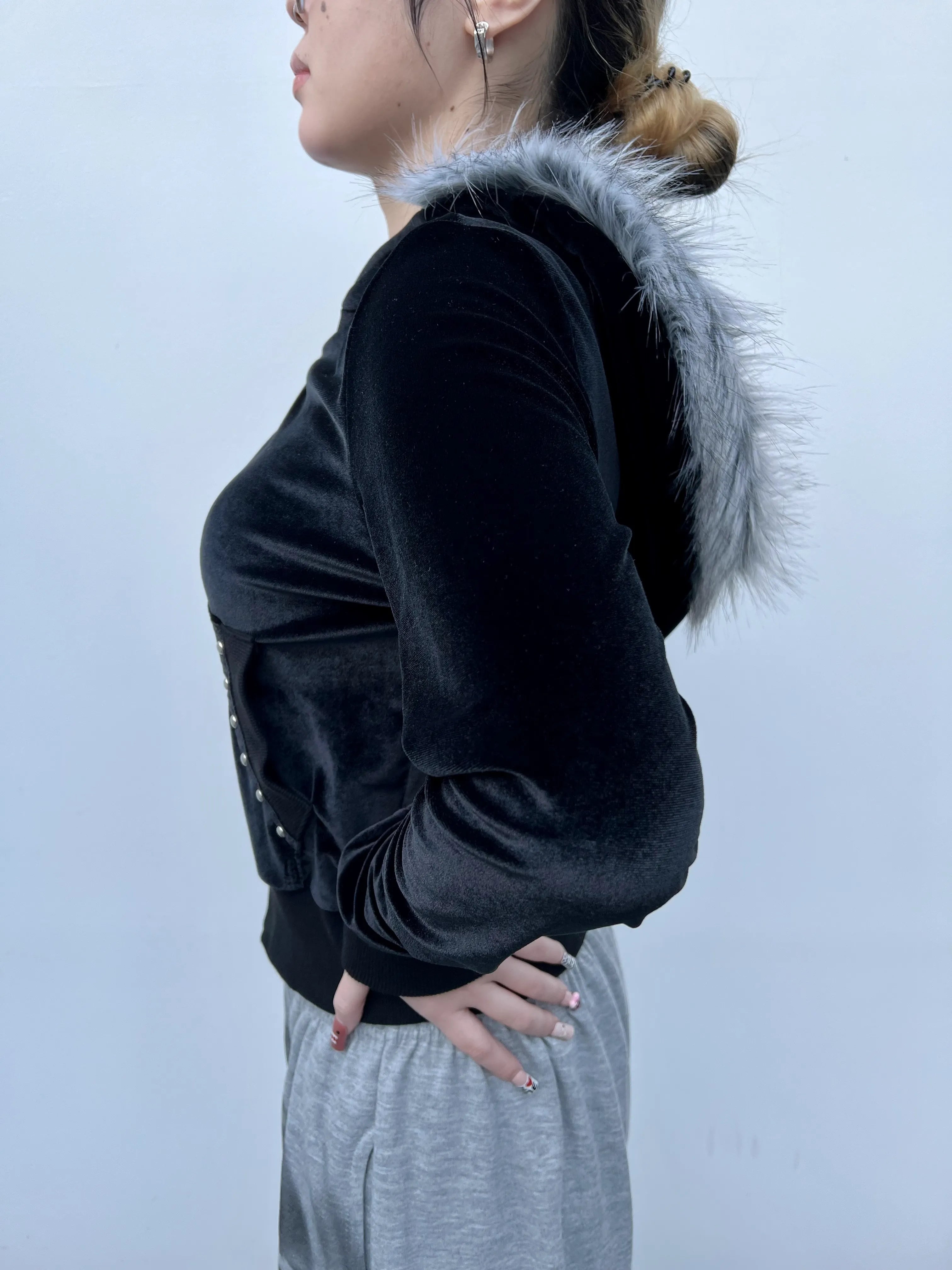 【POINT】⚫︎高級感のあるベロア×ファーデザイン 光沢のあるベロアと柔らかいフェイクファーのコンビでリッチな表情に。⚫︎ジップアップで着こなし幅が広い インナー調整や羽織りとしても使える万能タイプ。⚫︎スタッズ付きフロントでY2K感UP 細かいディテールがシンプルすぎない “ちょうど良い強さ” を演出。⚫︎しっとり柔らかい着心地のベロア素材 伸縮性もあり快適な着用感。