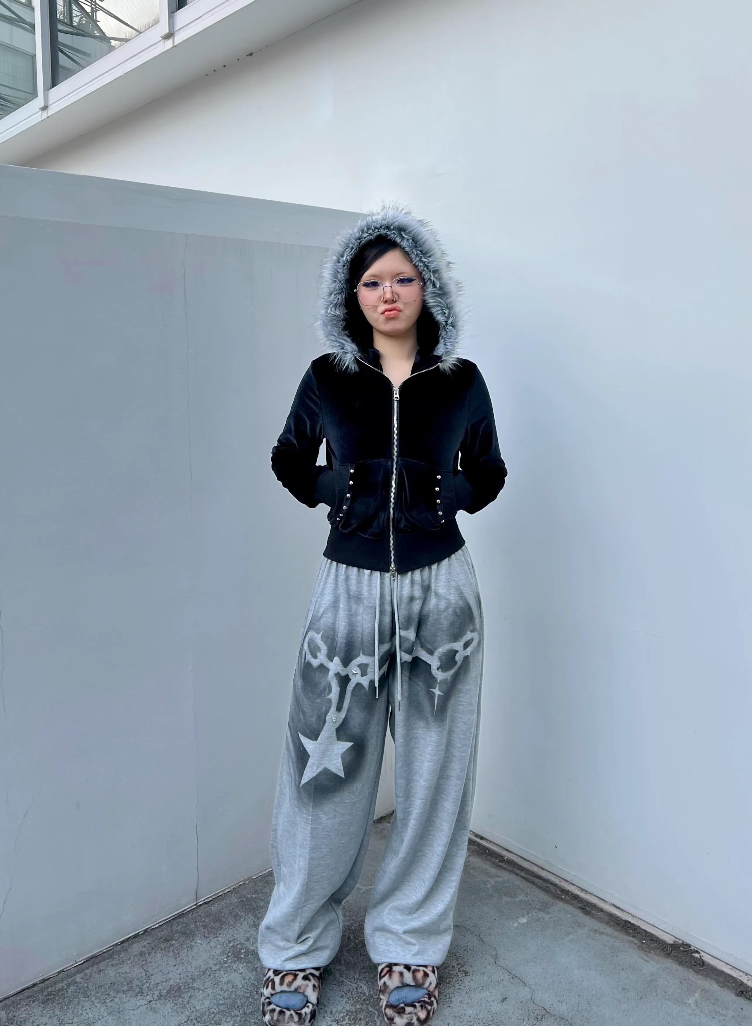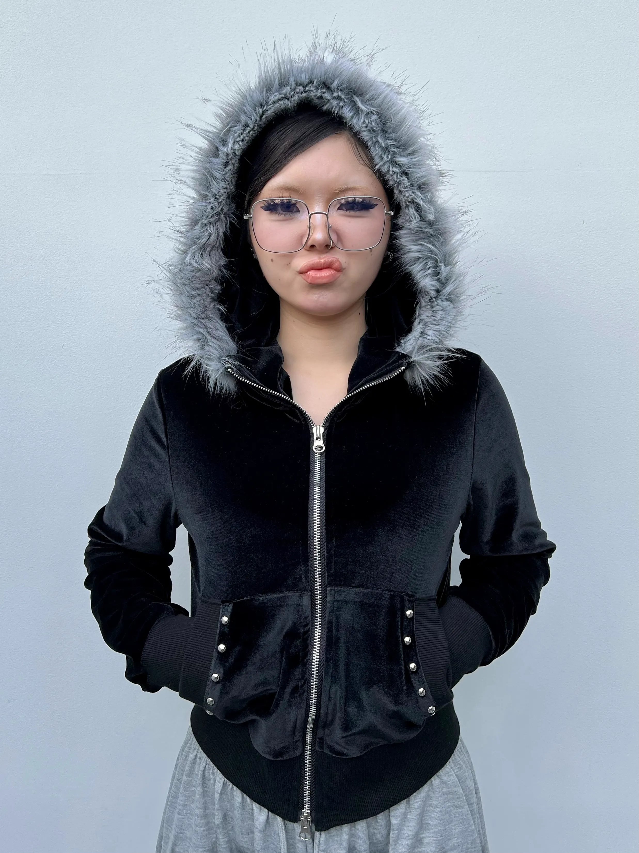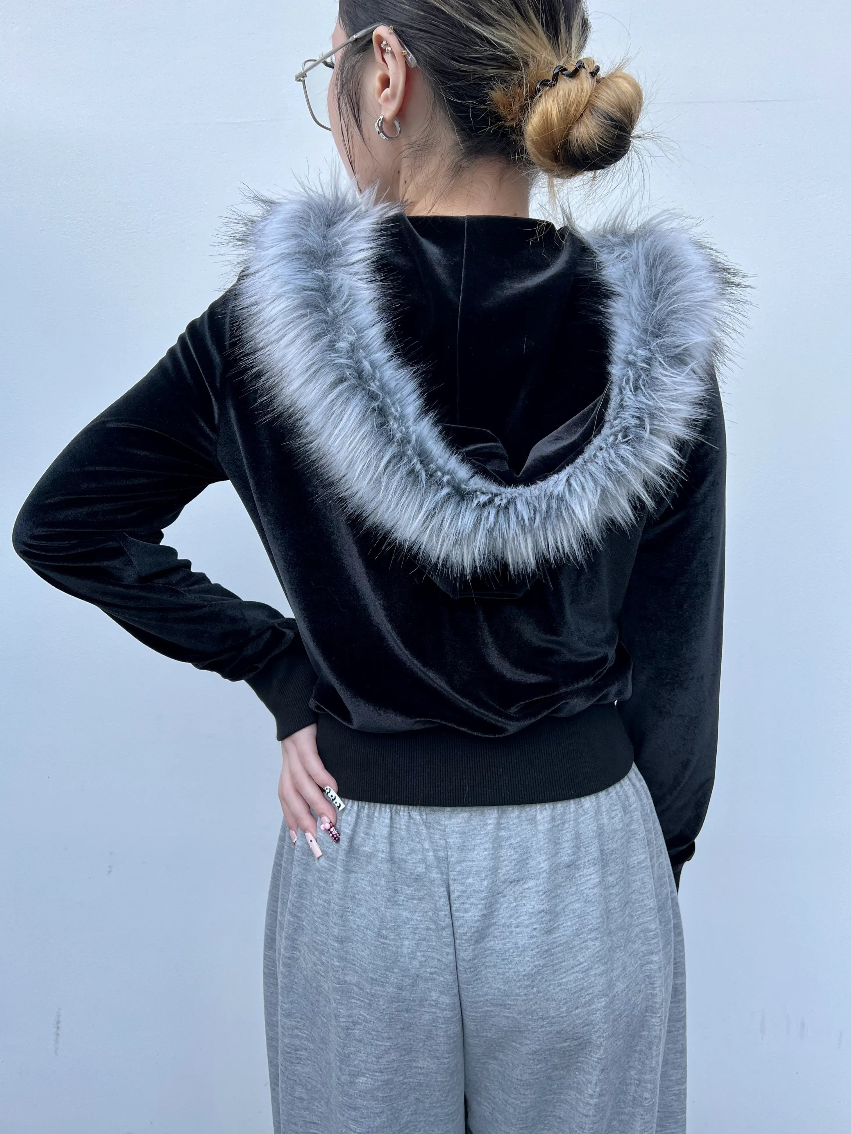 しっとりと光沢のあるベロア素材に、ふわっと高級感のあるフェイクファーフードを組み合わせたラグジュアリーベロアジップファーフーディー。柔らかく伸びるベロアボディが身体に馴染み、着心地の良さと女性らしいシルエットを両立。フロントのシルバースタッズがアクセントとなり、シンプルすぎないY2Kムードを演出してくれます。