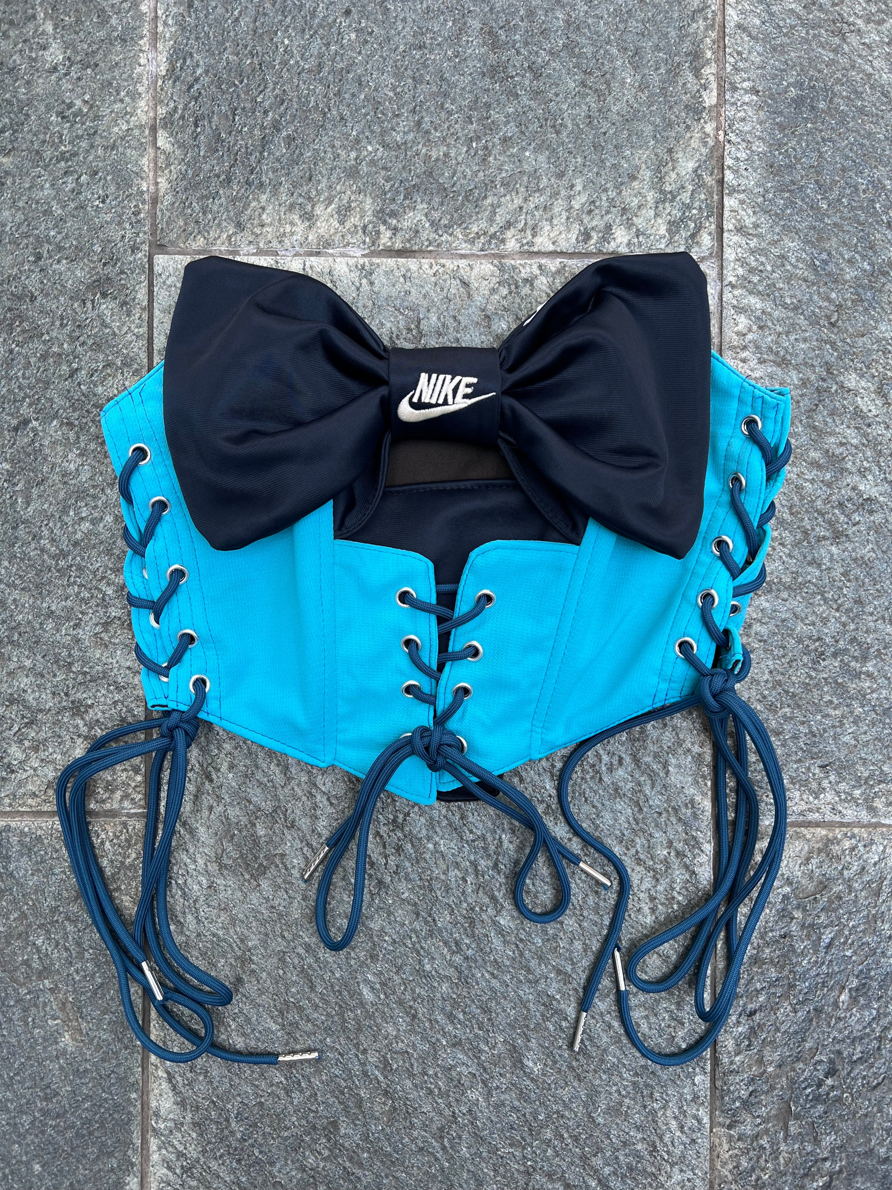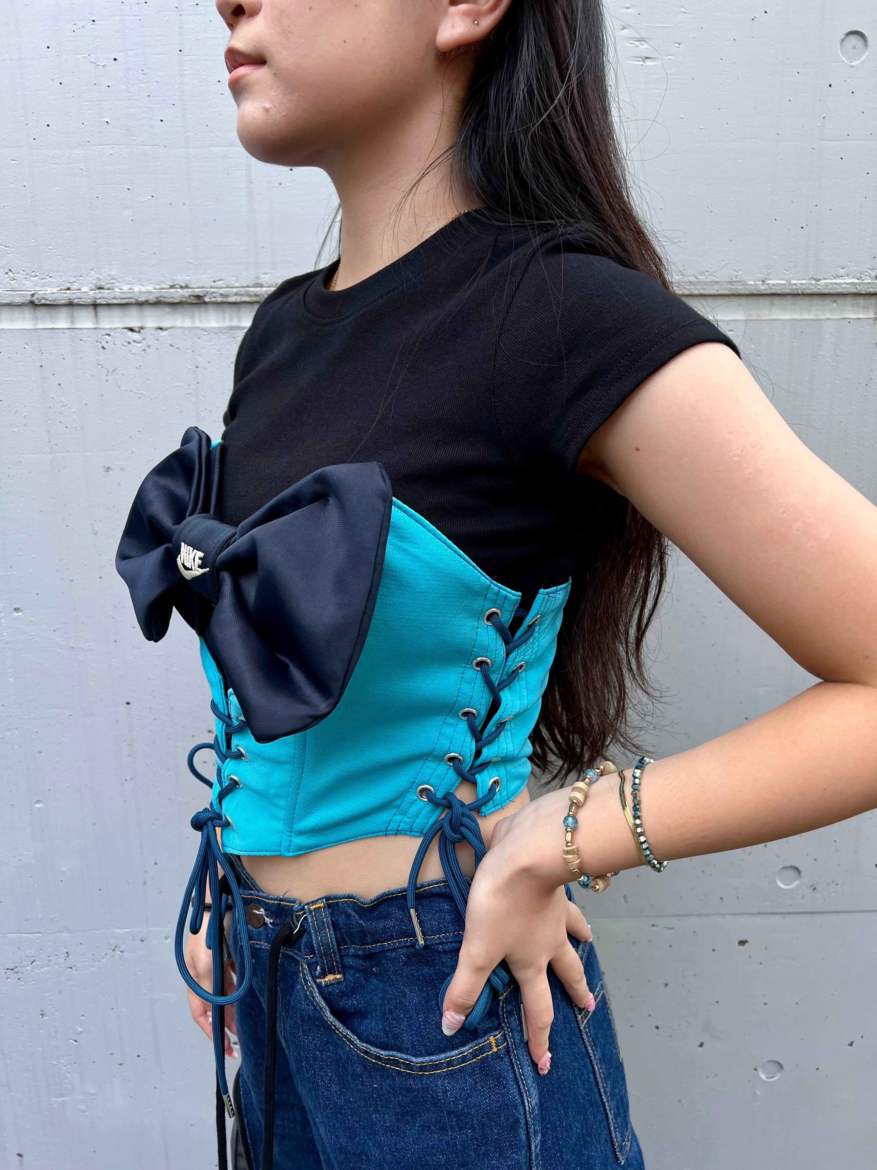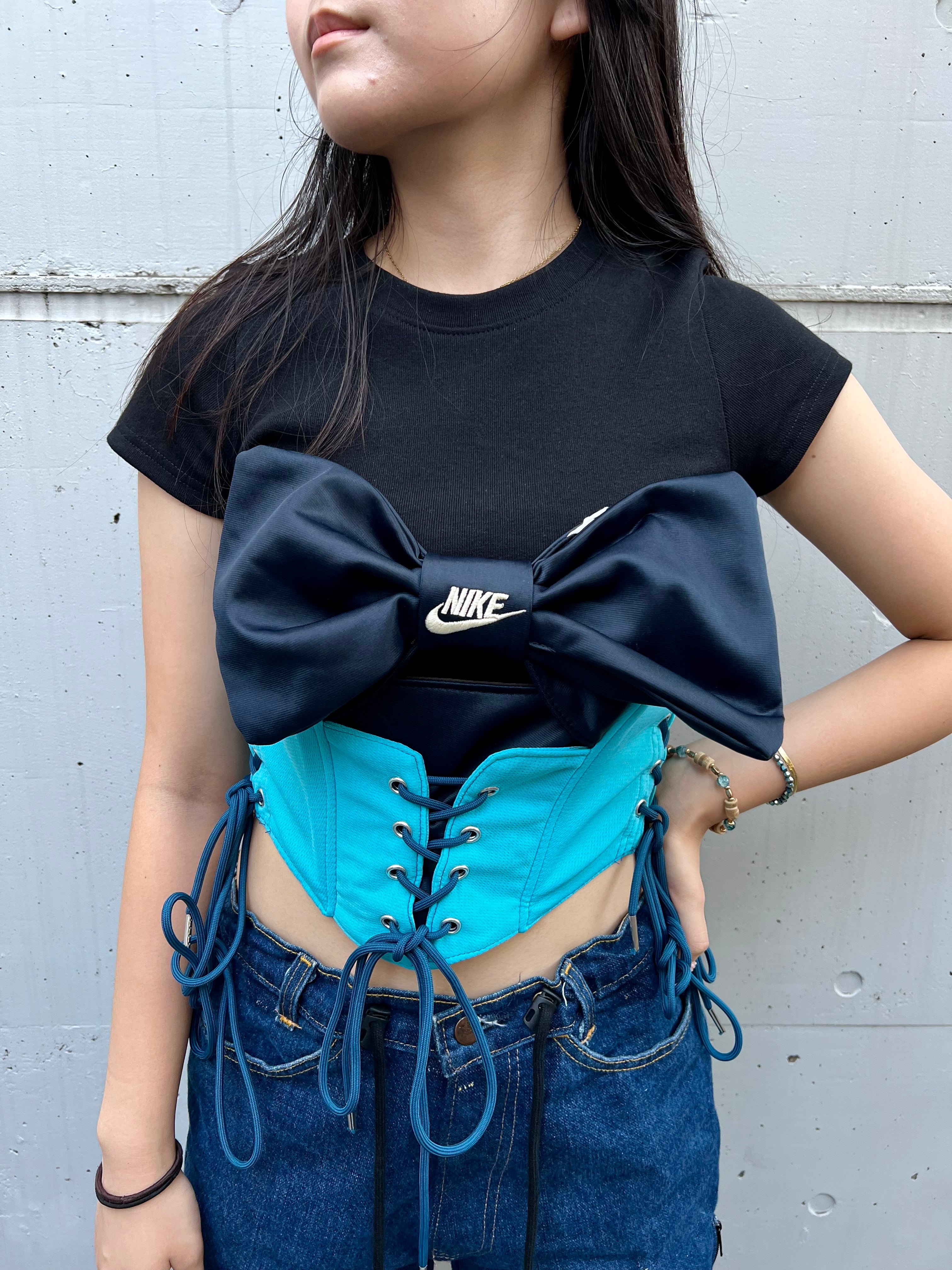大胆なリボンとサイドのレースアップが目を引く、スポーツブランドウェアをリメイクした一点モノのコルセットトップ。