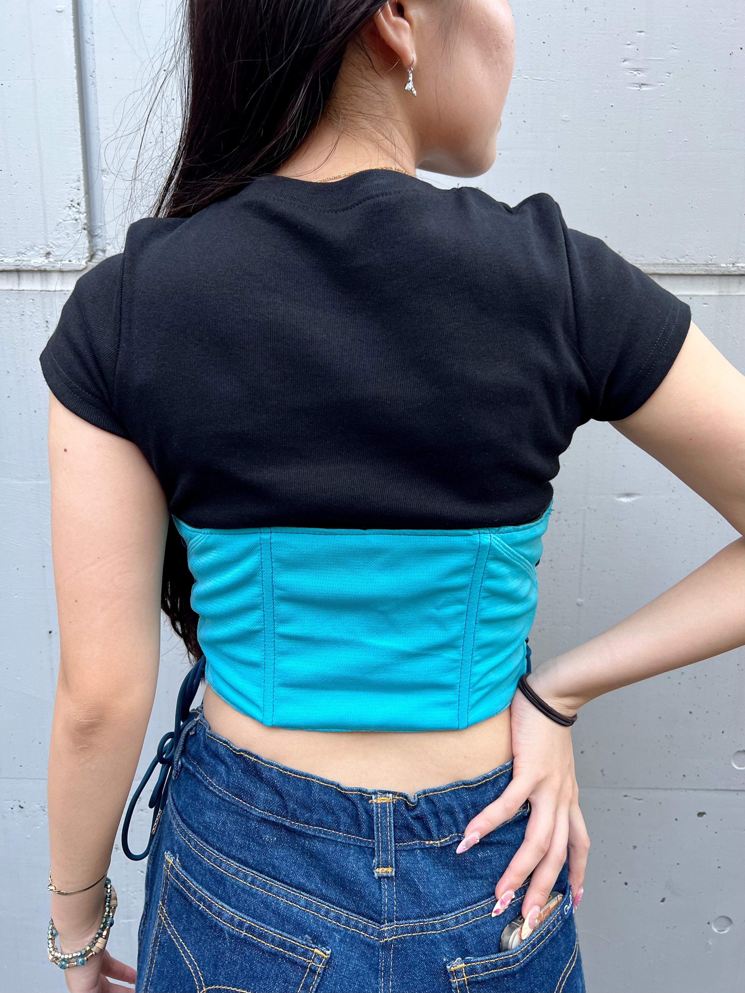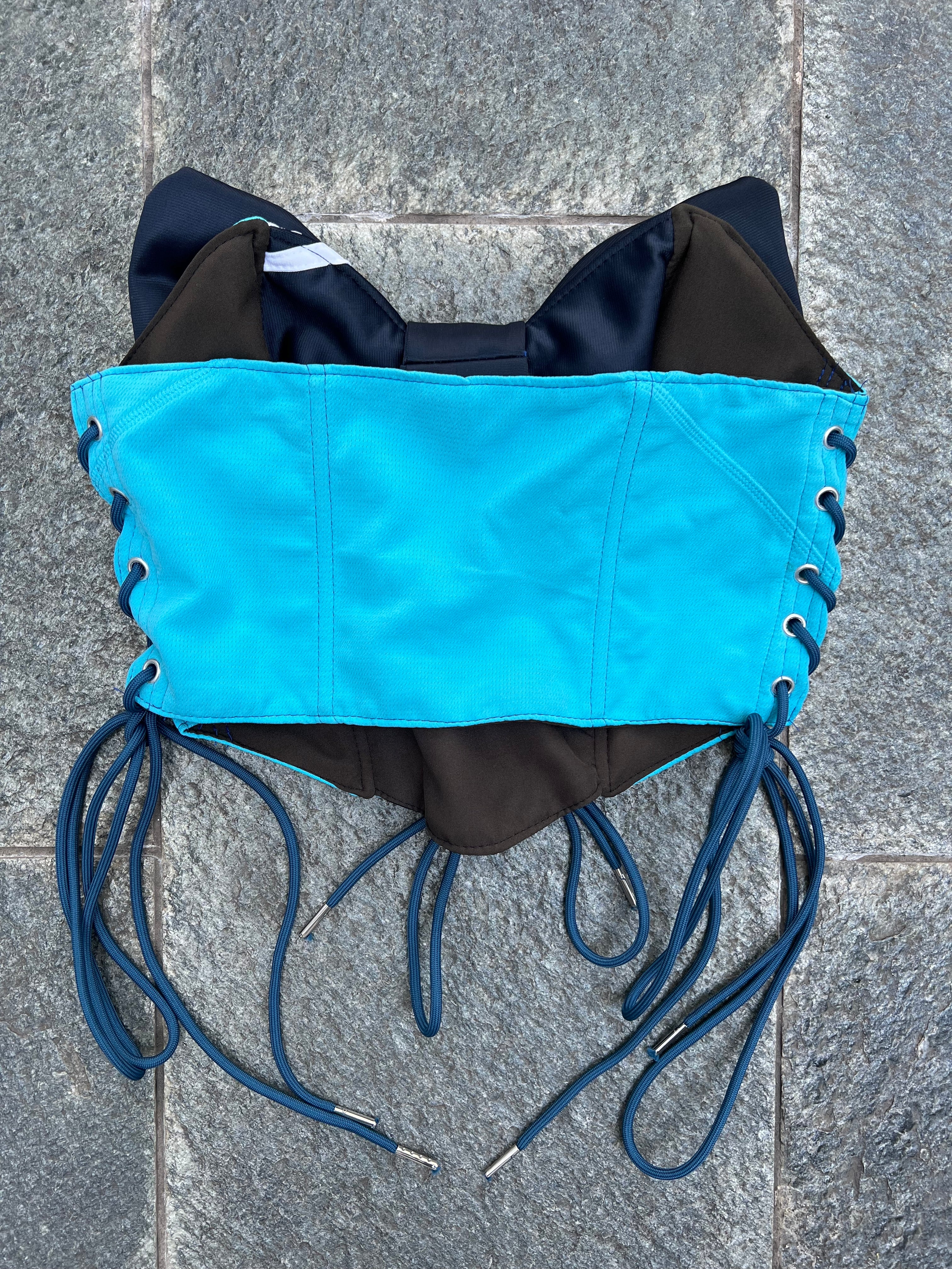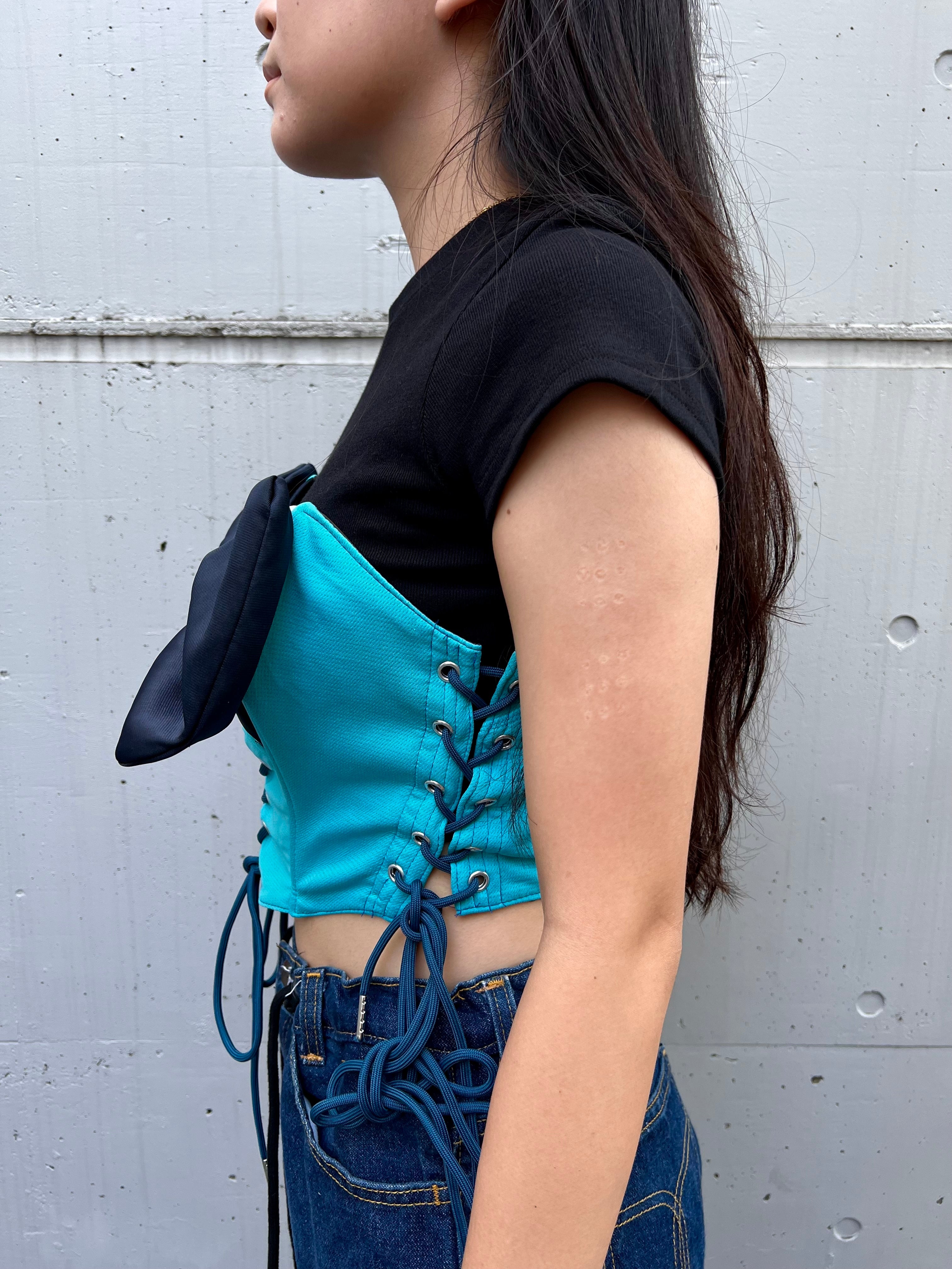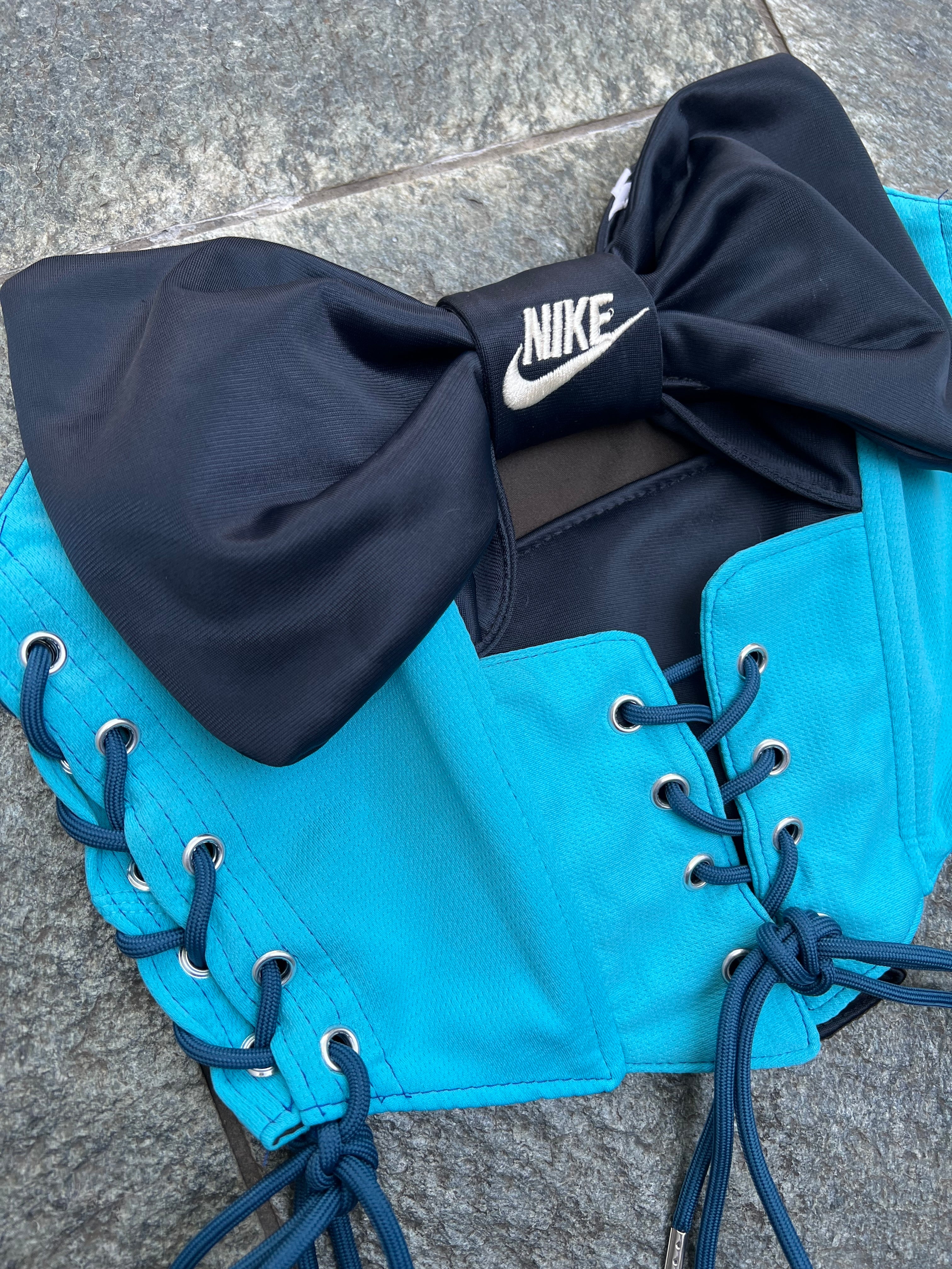 大胆なリボンとサイドのレースアップが目を引く、スポーツブランドウェアをリメイクした一点モノのコルセットトップ。