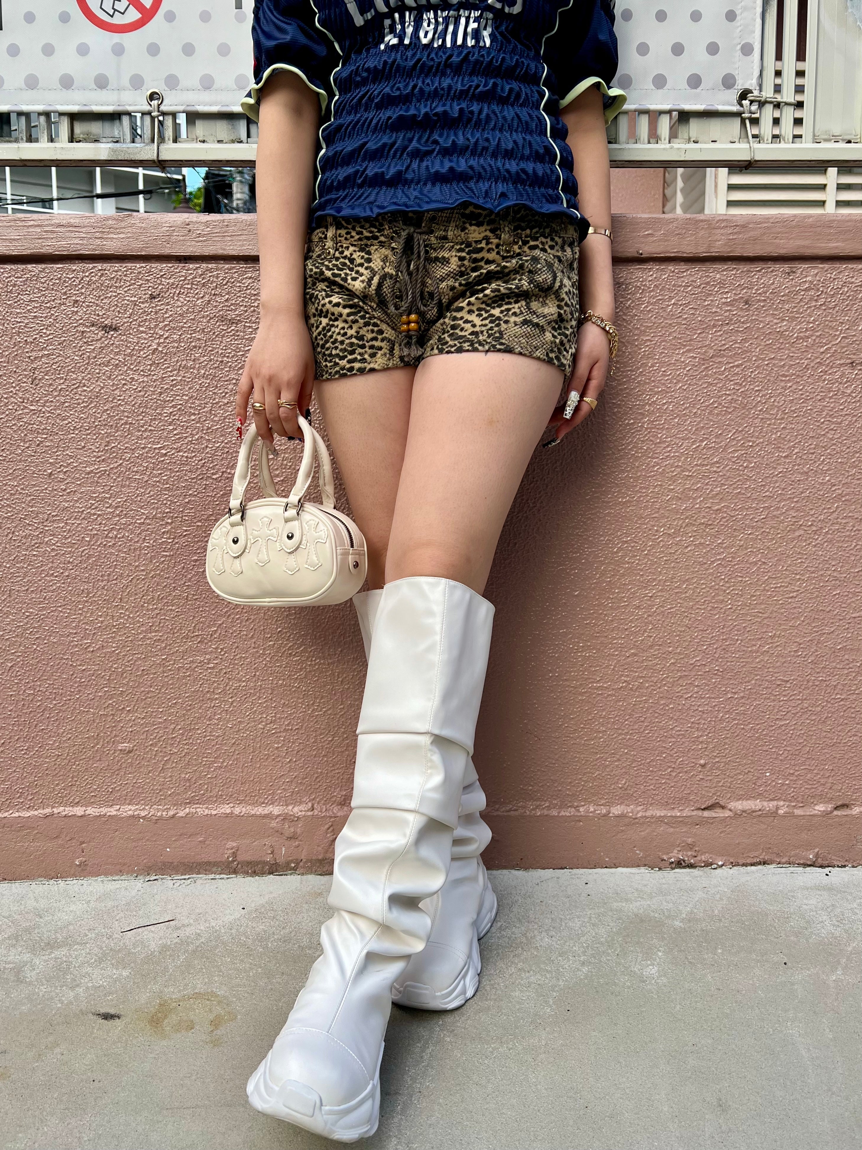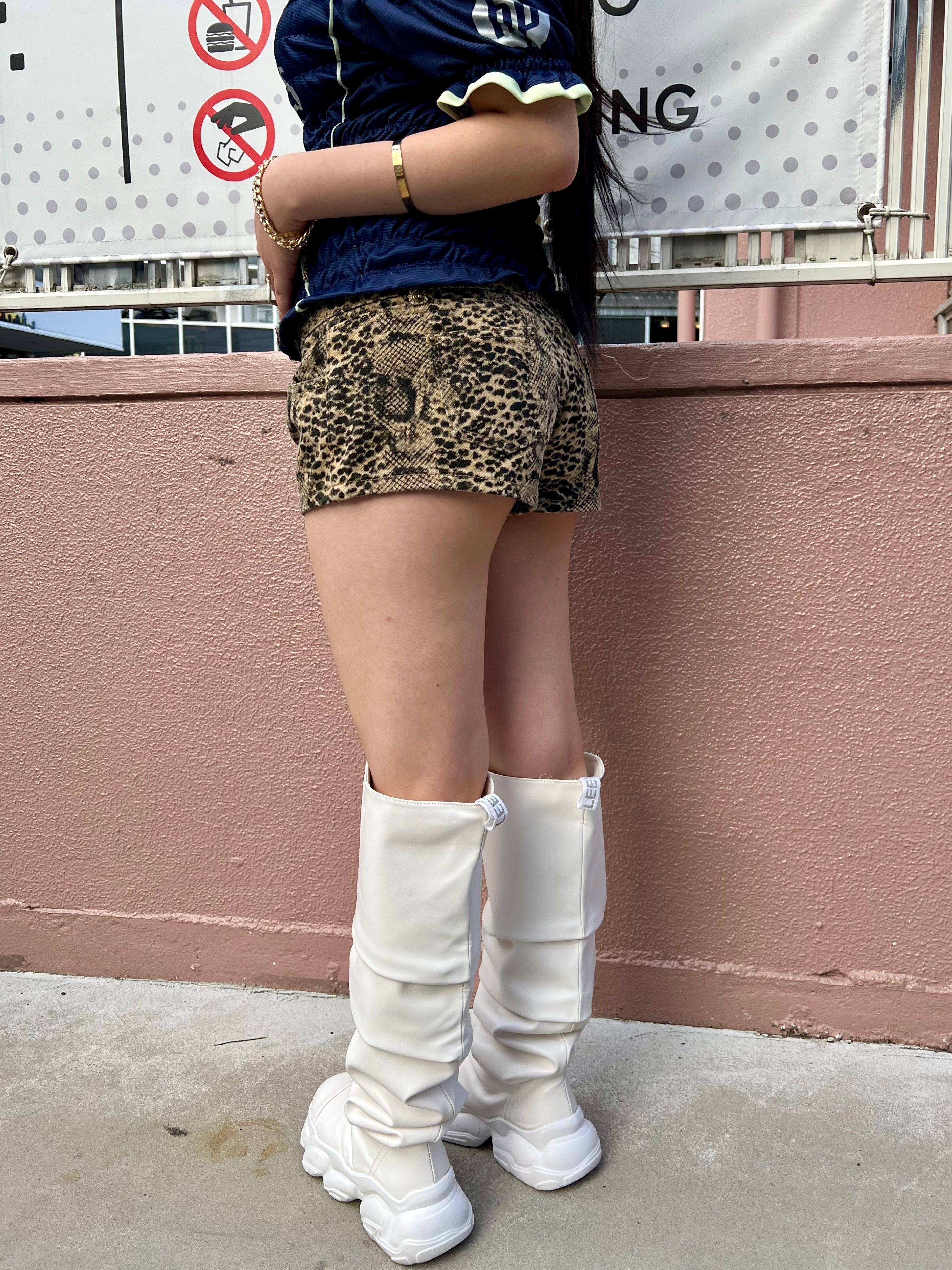 レオパード柄を全面に落とし込んだタイトシルエットのデニムショートパンツ。コンパクトな丈感が脚を長く見せ、スタイリングにスパイスを加えます。カジュアルながらも存在感が強く、シンプルなトップスと合わせるだけで個性派コーデが完成。